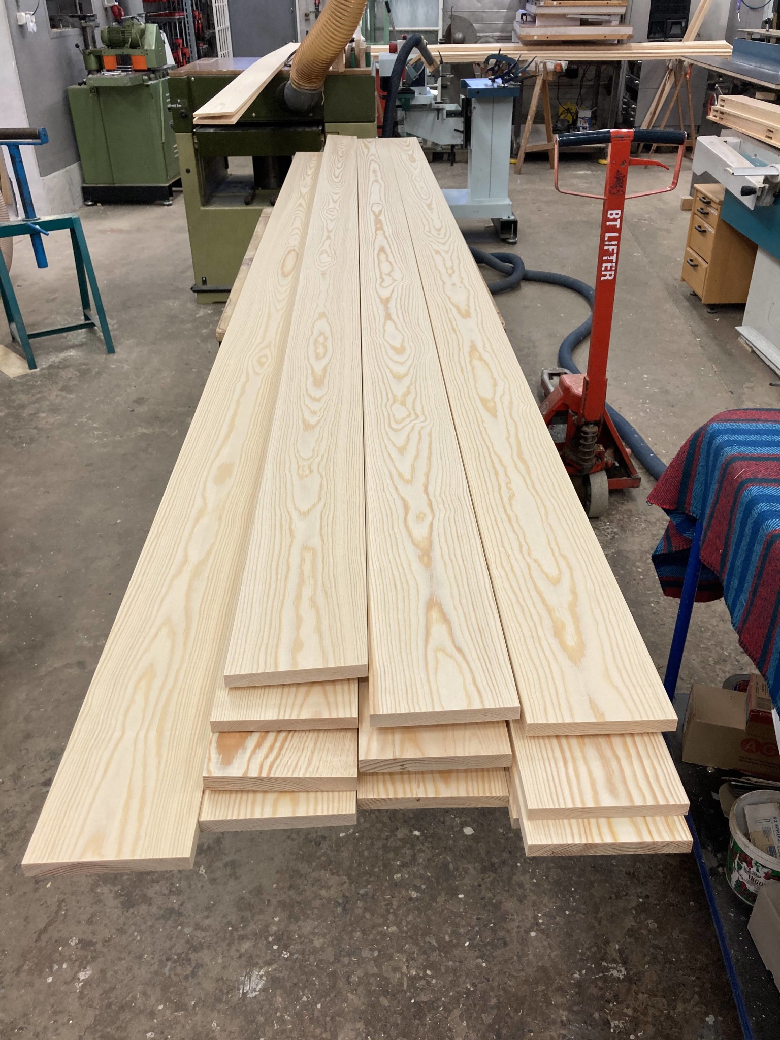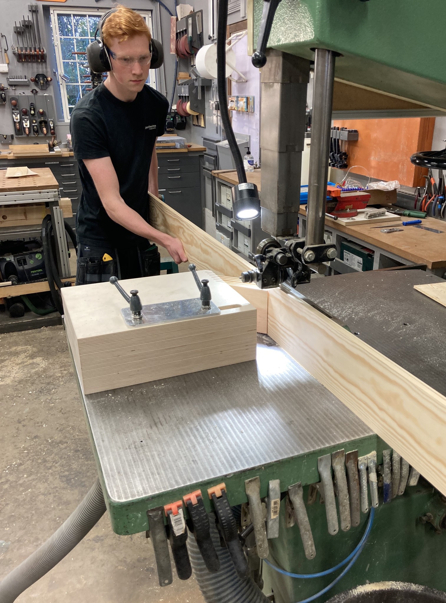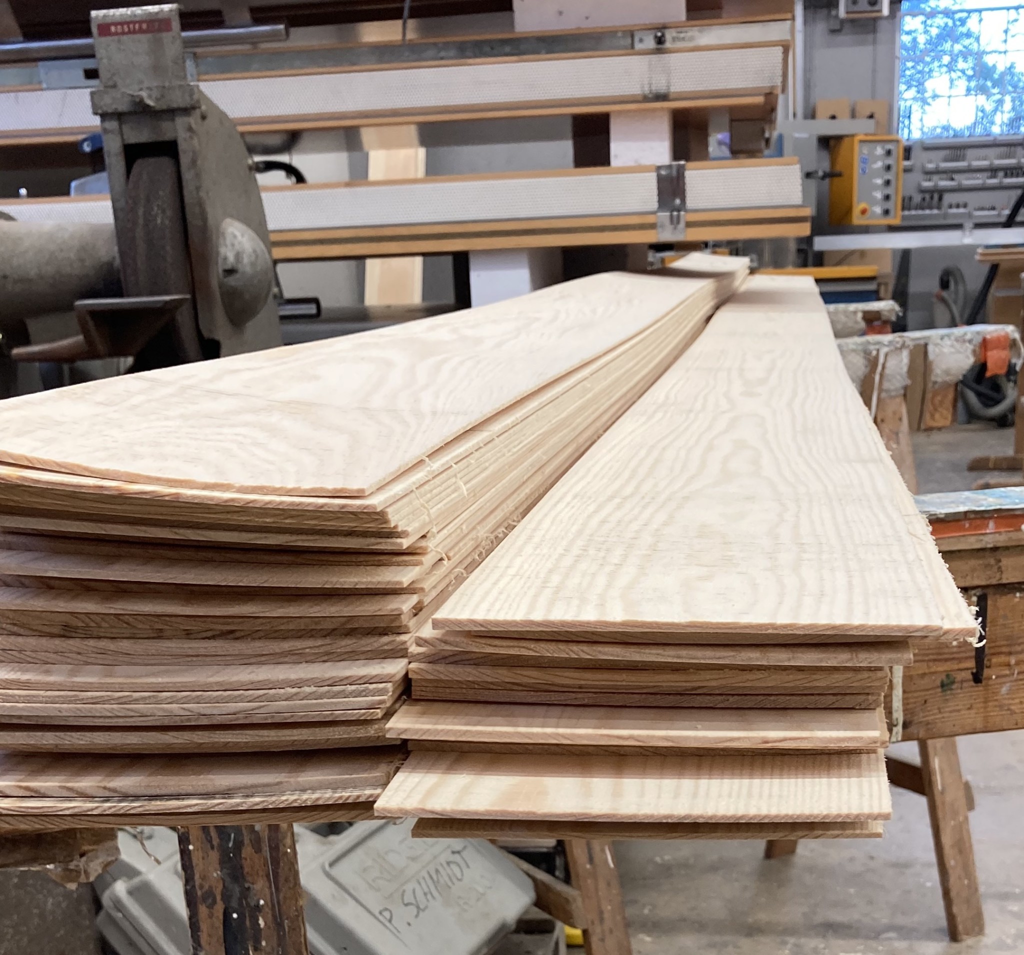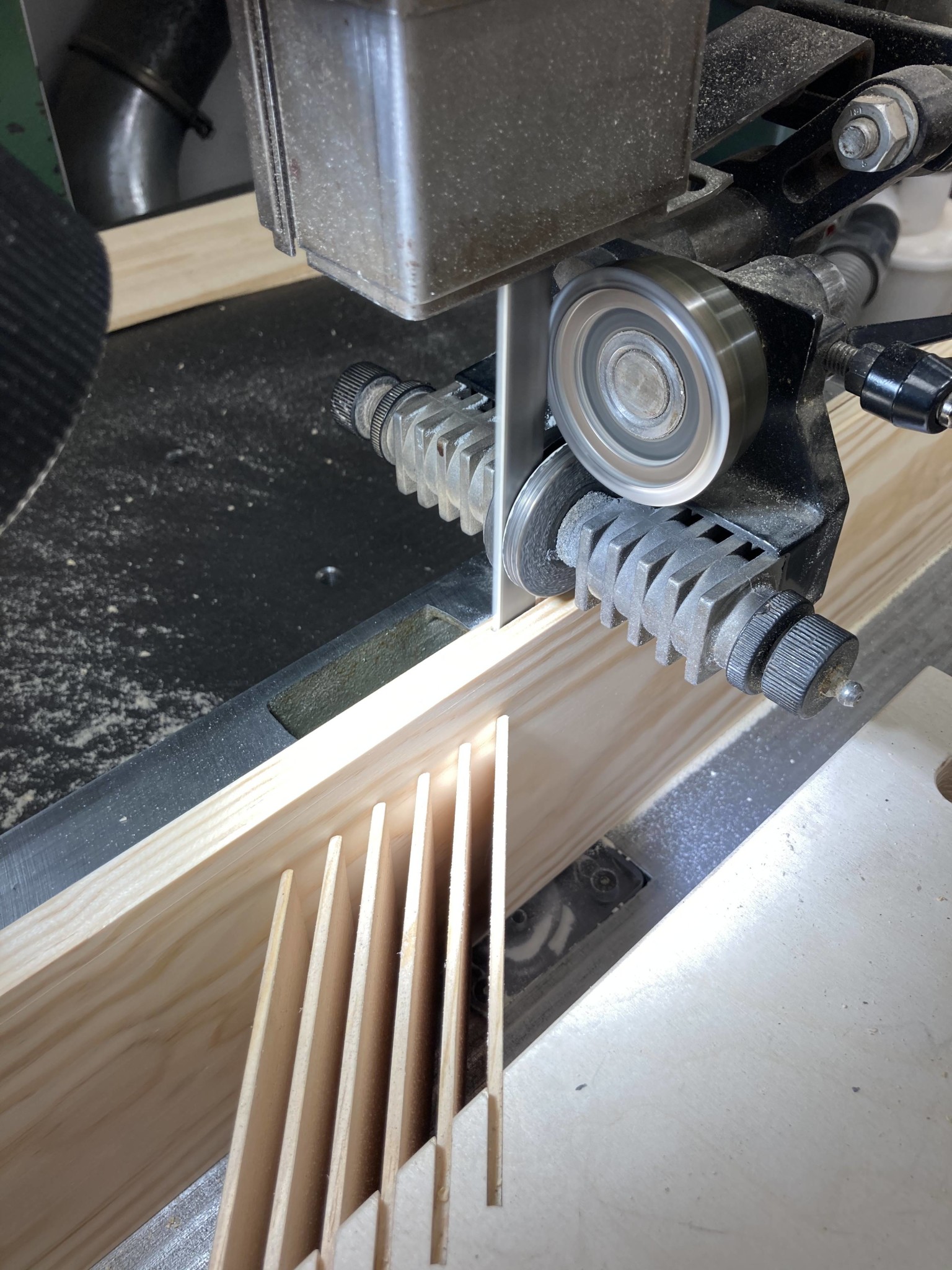 Idag har Jesper låtit den nytillverkade featherboarden gå varm med sågning av hundratals meter fanér. Ett nytt bimetallband, en mycket noggrann inställning av sågen och sen en matning runt 1,2m/minut visade sig vara ett fungerande recept. Det hade gått ännu bättre med ett hårdmetallband, lite grövre tandning och bättre utsug, då hade matningshastigheten kunnat ökas lite till. Featherboarden har fungerat utmärkt och ger ett jämnt tryck längs hela plankans höjd och oavsett var man själv står och puttar på, speciellt viktigt eftersom bitarna är väldigt långa.
