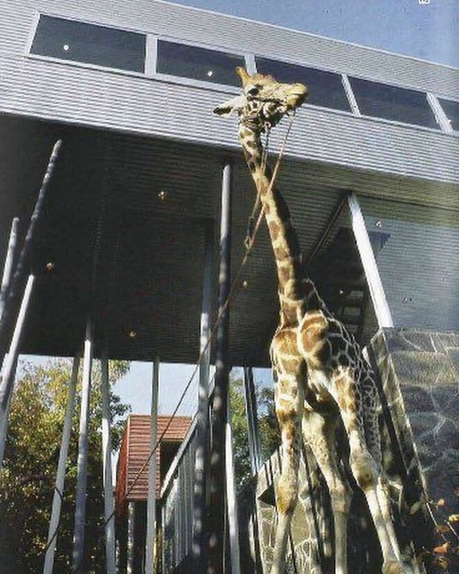 Arkitekturinriktningen har en viss förkärlek för det surrealistiska. Smidigt att ha en giraff på plats när bygget fotas.