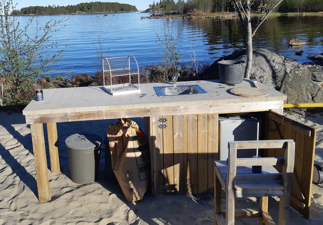 Jag sparkar igång med mitt nu mera bortforslade utekök (som ska ersättas med ett nytt). Inget märkvärdigt men rinnande varmt och kallt vatten och ölkyl. [bild]