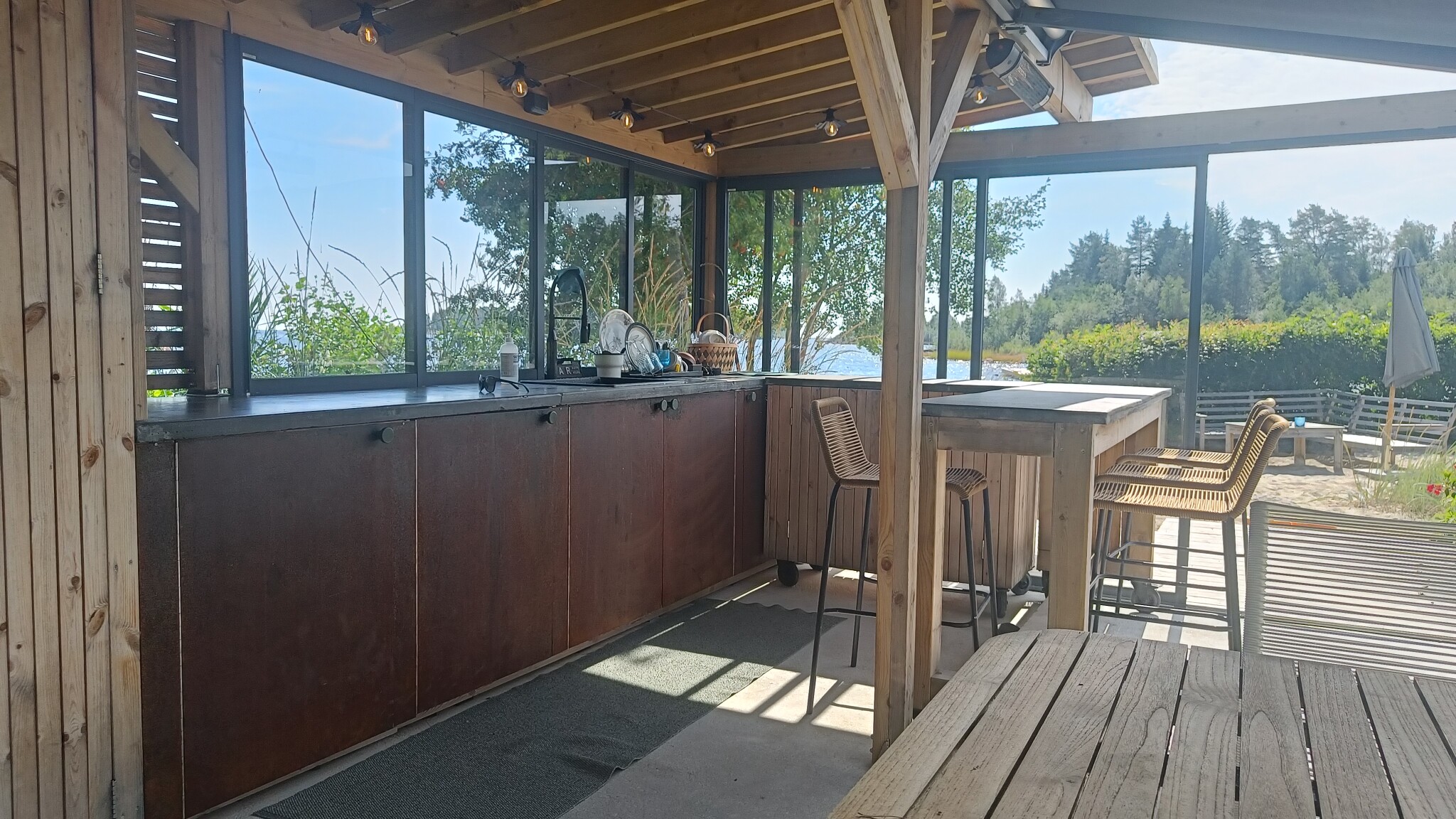 Denna tråd hade jag helt glömt bort. Mitt nya utekök är några år gammalt nu men här kommer några bilder om någon annan skulle vara på jakt efter inspiration.