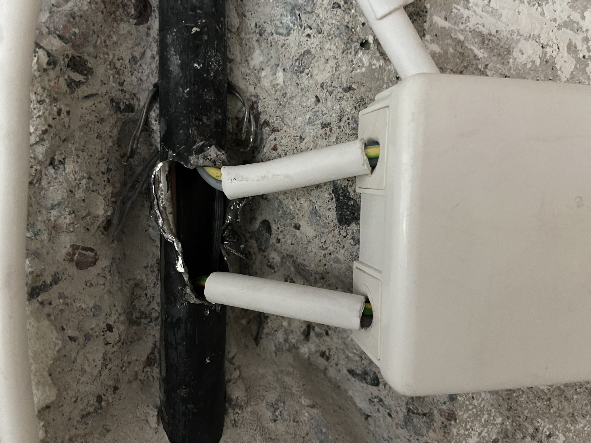 Sen verkar det som man har ”tagit” några av ledarna som matar perilexuttaget och dragit in det i en dosa och sedan vidare till ett vanligt eluttag där inbyggnadsugn sitter. Se bild nedan(sladden som går ut upptill går alltså till ett vägguttag som sen ugnen är kopplad in i.