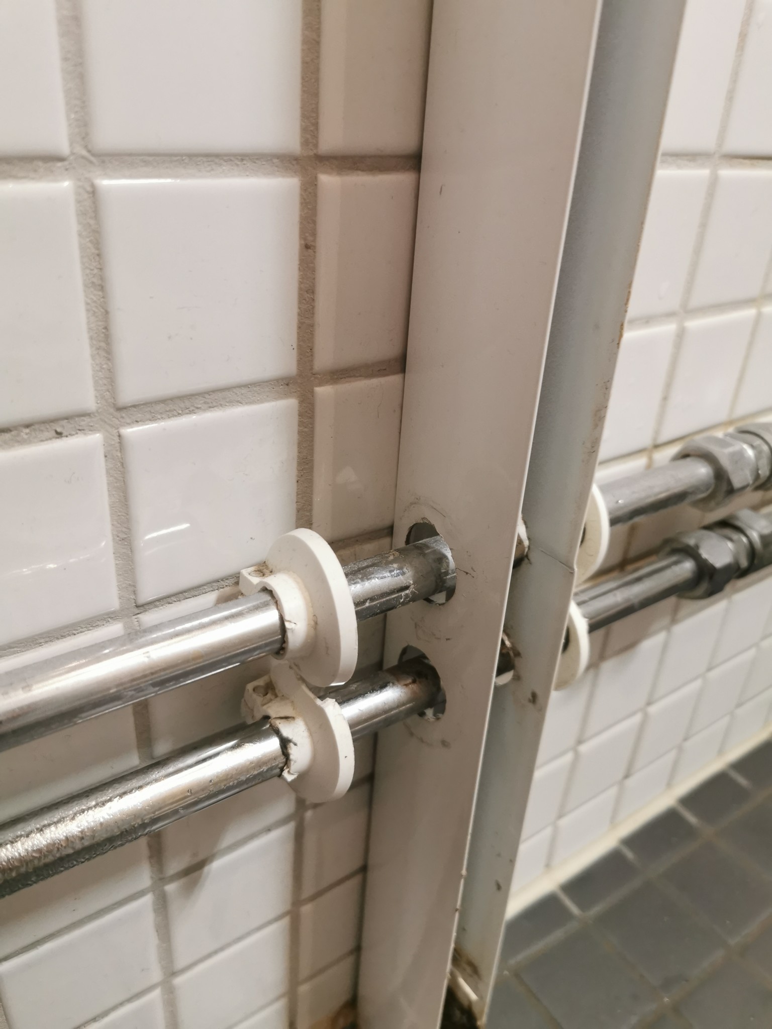 Hej, hur kommer jag åt detta på bästa sätt? Skenorna till duschväggarna skall ner och det har tidigare borrats och förts på utanpåliggande rören. Denna skena skulle gå att föra ur rören vid öppningen till höger. Men den andra är svårare då kommod och duschblandare är i vägen. Skruvar helst i rören så lite som möjligt.