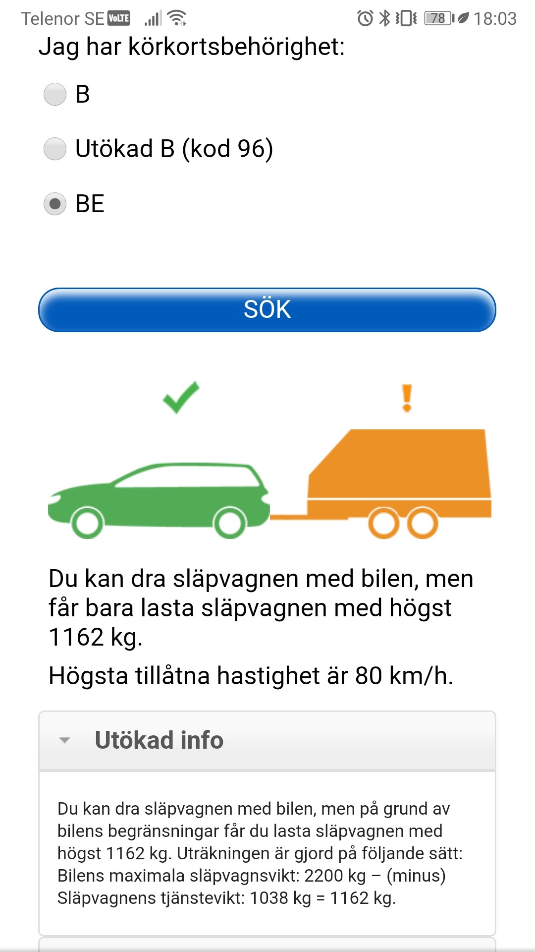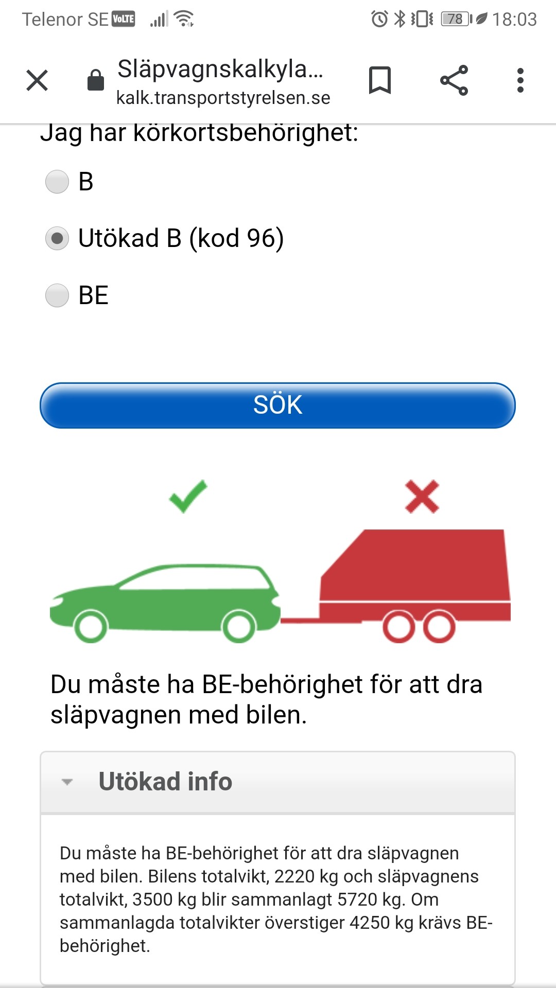 Ok, det jag menar med 7000kg-protesten är att du inte får räkna samman bil och släp och se att det blir 7000kg. Tex är 3000kg + 4000kg en otillåten kombination. Nu tror jag det är rätt ovanligt med kombinationer som faller utanför detta, men regeln är att max totalvikt på släpet är 3500kg för nya BE, inte att tågvikten är 7000kg. Glöm 7000kg helt.J Jarlsgård skrev:1. Har aldrig sagt att man får dra 7000 kg, det jag sa var en max totalvikt på 7000kg för hela ekipaget. Skrev även "varierar lite beroende på utförandeår" och med det sagt så vet jag att alla inte har en max totalvikt. Så jag utgick ifrån att om man tagit kortet nu.