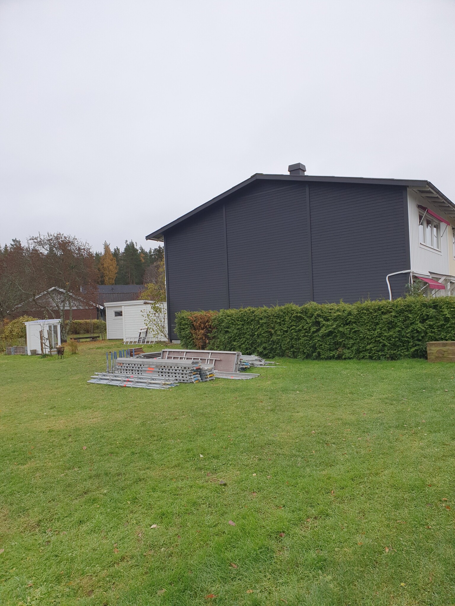 Vi ska tilläggsisolera vår norrfasad som har 90 mm isolering enligt 70-talsnormer. Ska ta ner teglet, isolera etc. och sätta liggande panel. Idag fick jag det glädjande beskedet från kommunen att jag inte behöver bygglov och därmed sparar 9600 kr, men då slår det mig plötsligt att liggande panel på hela denna yta utan fönster (11 meter och 6 meter i nock) kanske kommer att se väldigt sterilt ut. Finns det någon här som har någon idé på hur man kan bryta av på ett snyggt sätt? Det skall vara vitt som resten av huset om det nu har någon betydelse.