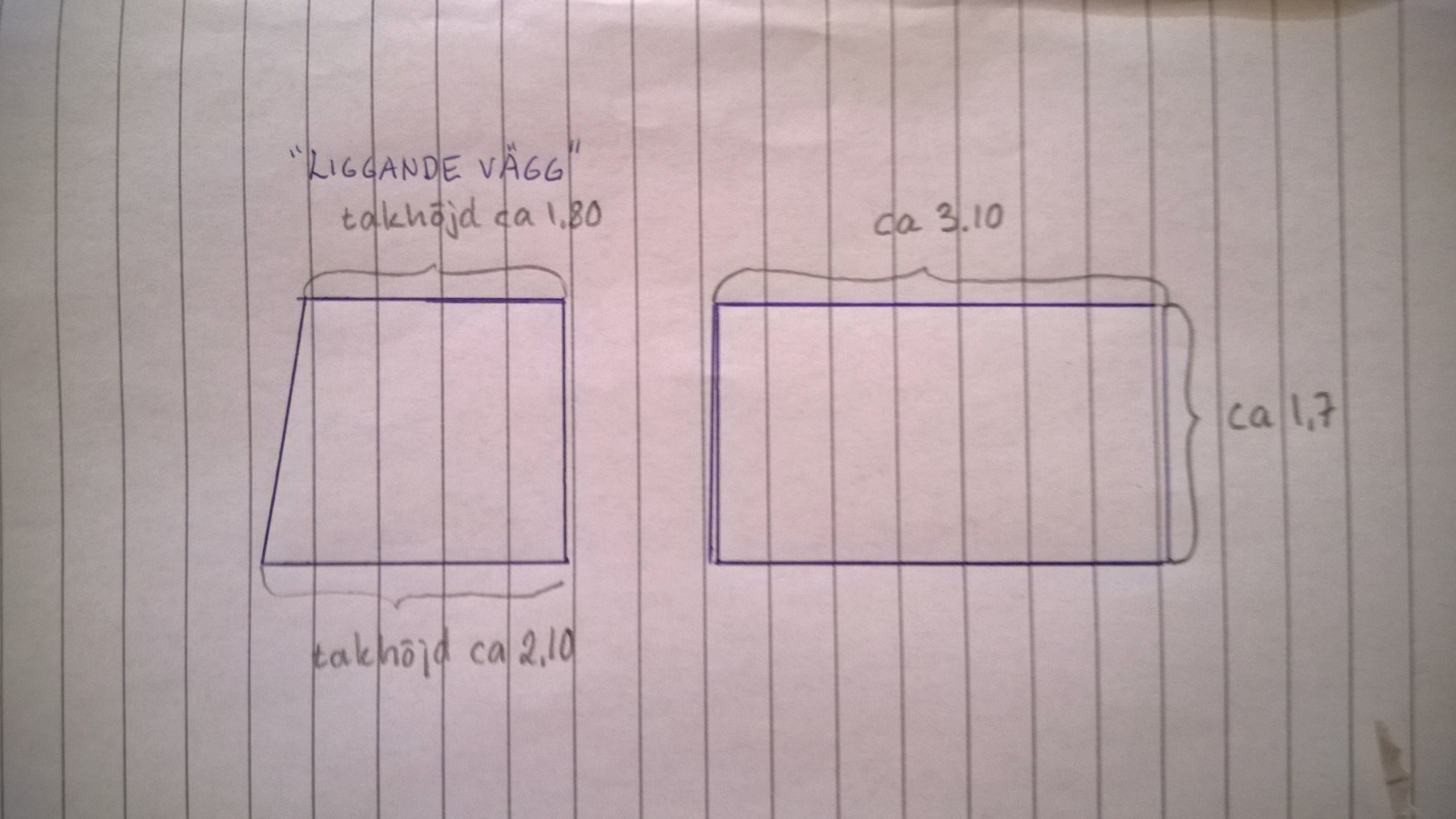 Måtten är ca 3,10 *1,8 meter. (Idag är det egentligen bara 1,8 * ca 1,73 men vi tar klädkammaren som ligger vägg i vägg i anspråk för ett större badrum... hoppas vi inte gör bort oss där men båda sovrummen på övervåning har både ett antal garderober och klädkammare).