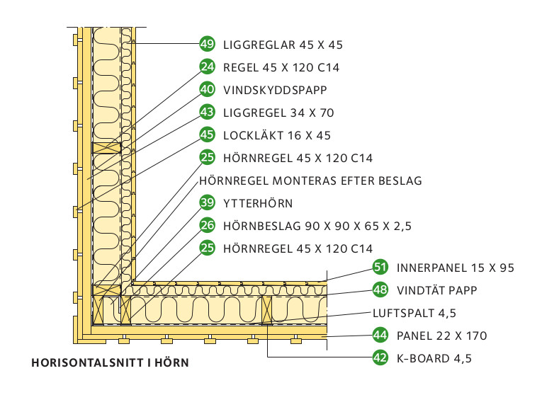 Detta är klippt från byggbeskrivning "Enkla Stugan". De horisontella liggreglarna (49) snedsågas i innerhörn så de går att spika de stående hörnreglarna (25).