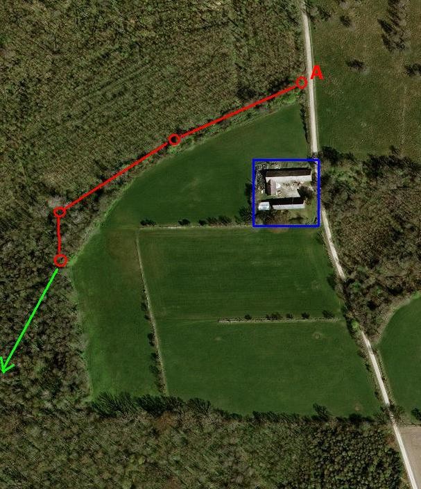 Nivåskillnad i mark är cirka 10 meter från bildens ovankant till nederkant, det sluttar alltså stadigt neråt. Brunn A är cirka 60 meter norr om min fastighetsgräns och cirka 1 meter högre upp i marknivå. När det mycket vatten ex.vis. vid regn eller vårflod ligger vattennivån vid brunn A över min tomts marknivå (mätt detta med laservattenpass).