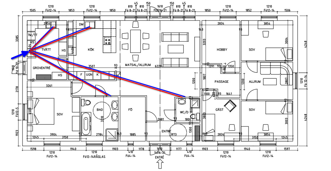 Jag fick tipset att köra varsin matning med 15mm till vasken i tvättstugan och diskho+diskmaskin i köket. Sedan 18mm till respektive fördelare i badrum och utifrån dessa köra med 15mm till handfat, dusch osv.