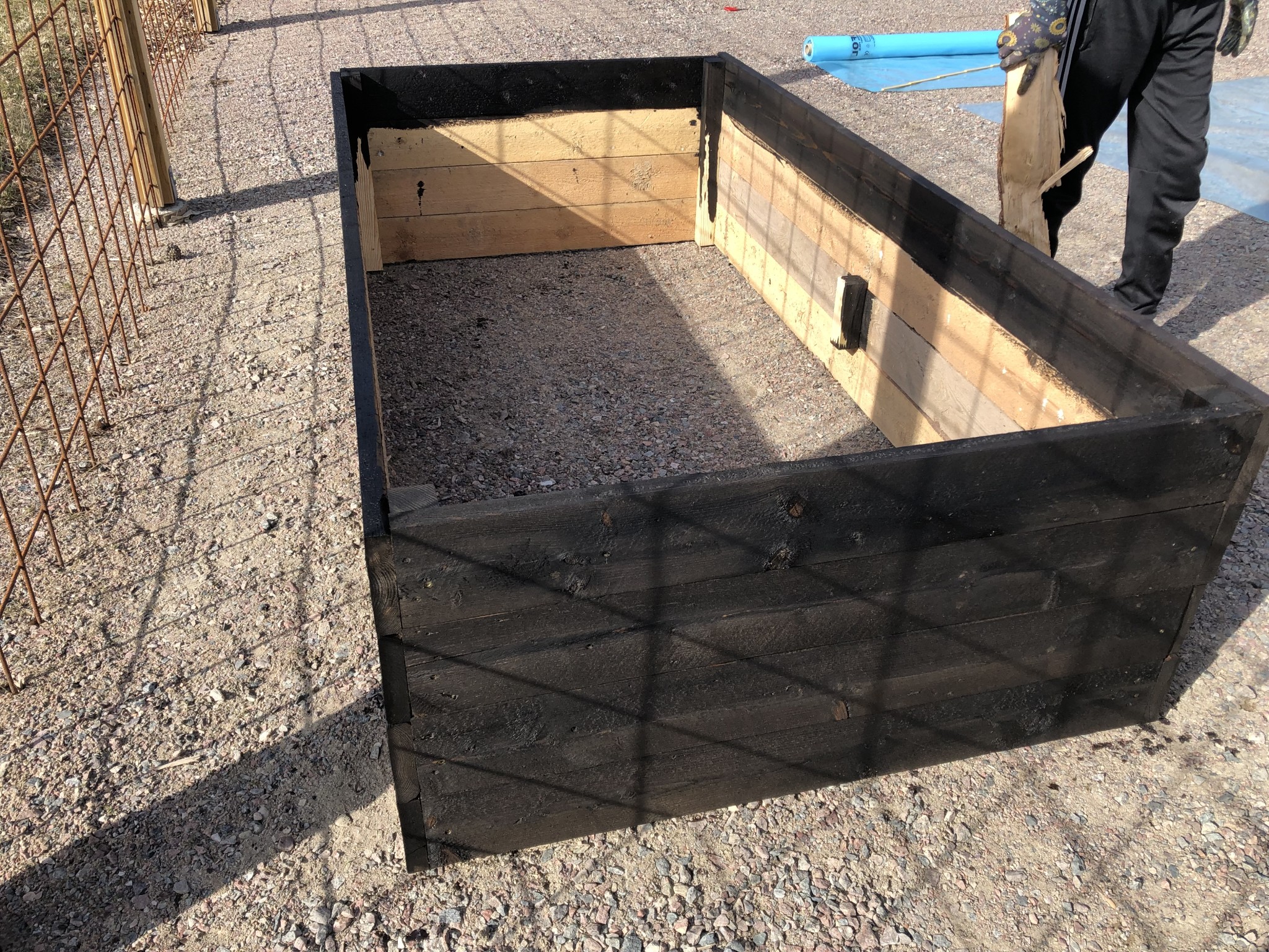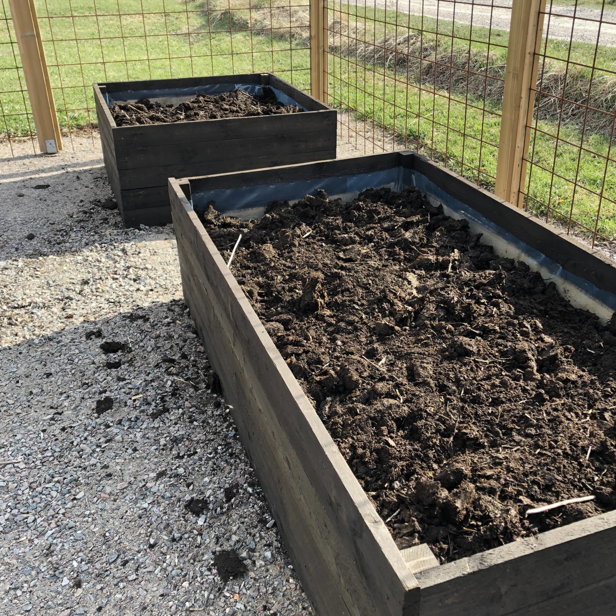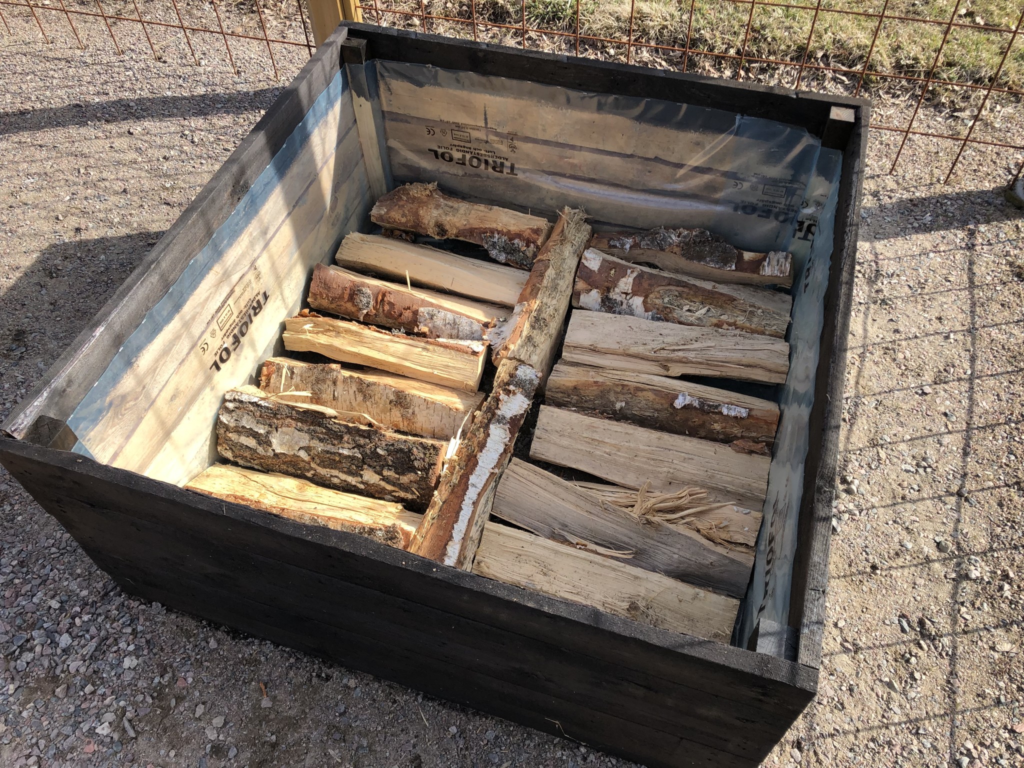 Börjat bygga odlingslådorna. Lite olika höjd och storlekar av diverse spillvirke på gården. Fyllt upp med grannens fjolårs-kobajja men först blev de klädda i byggplast och ett varv i botten med 50cm vedklabbar för småkrypens skull. Svart slipersolja för utseendets skull