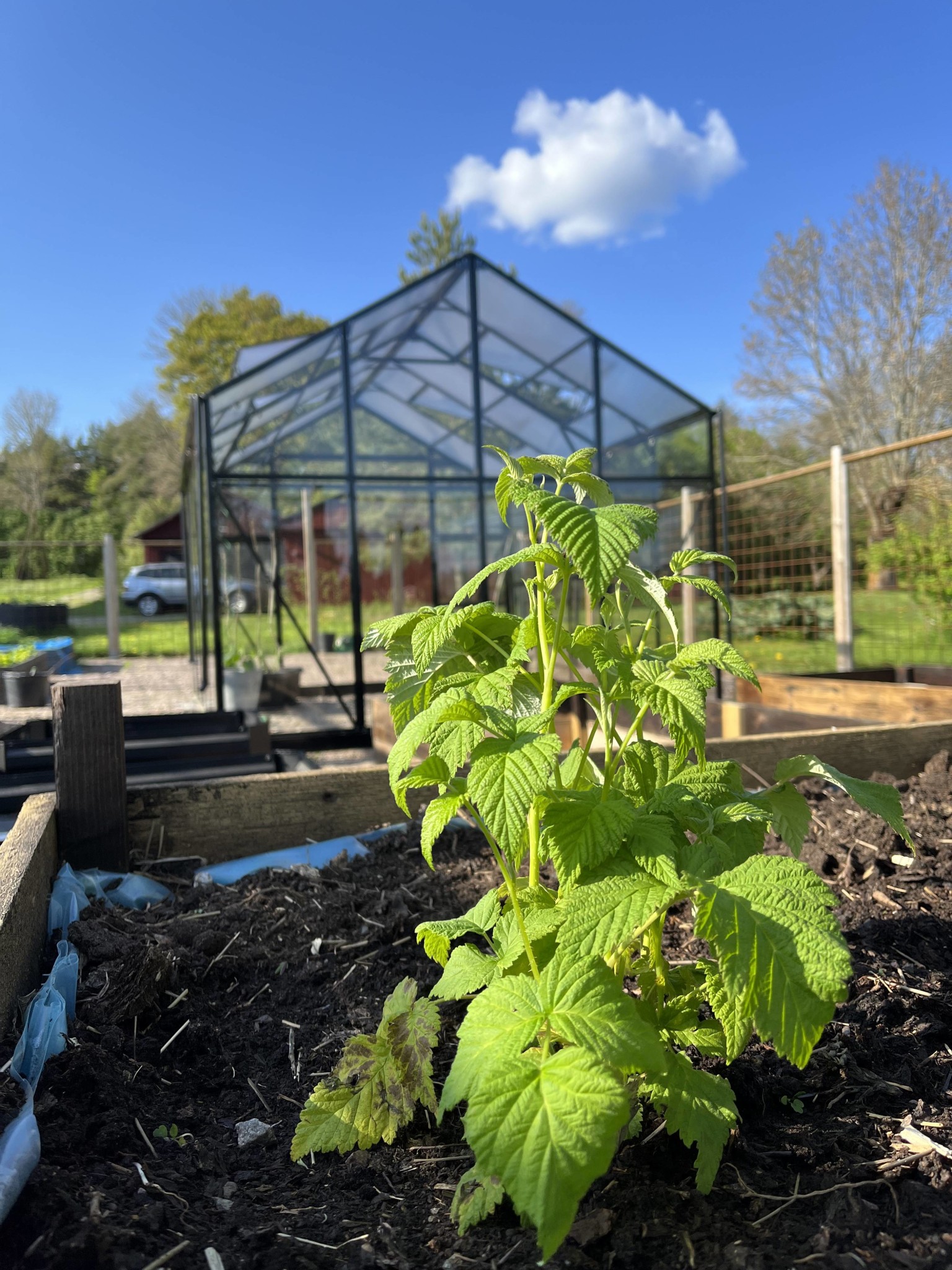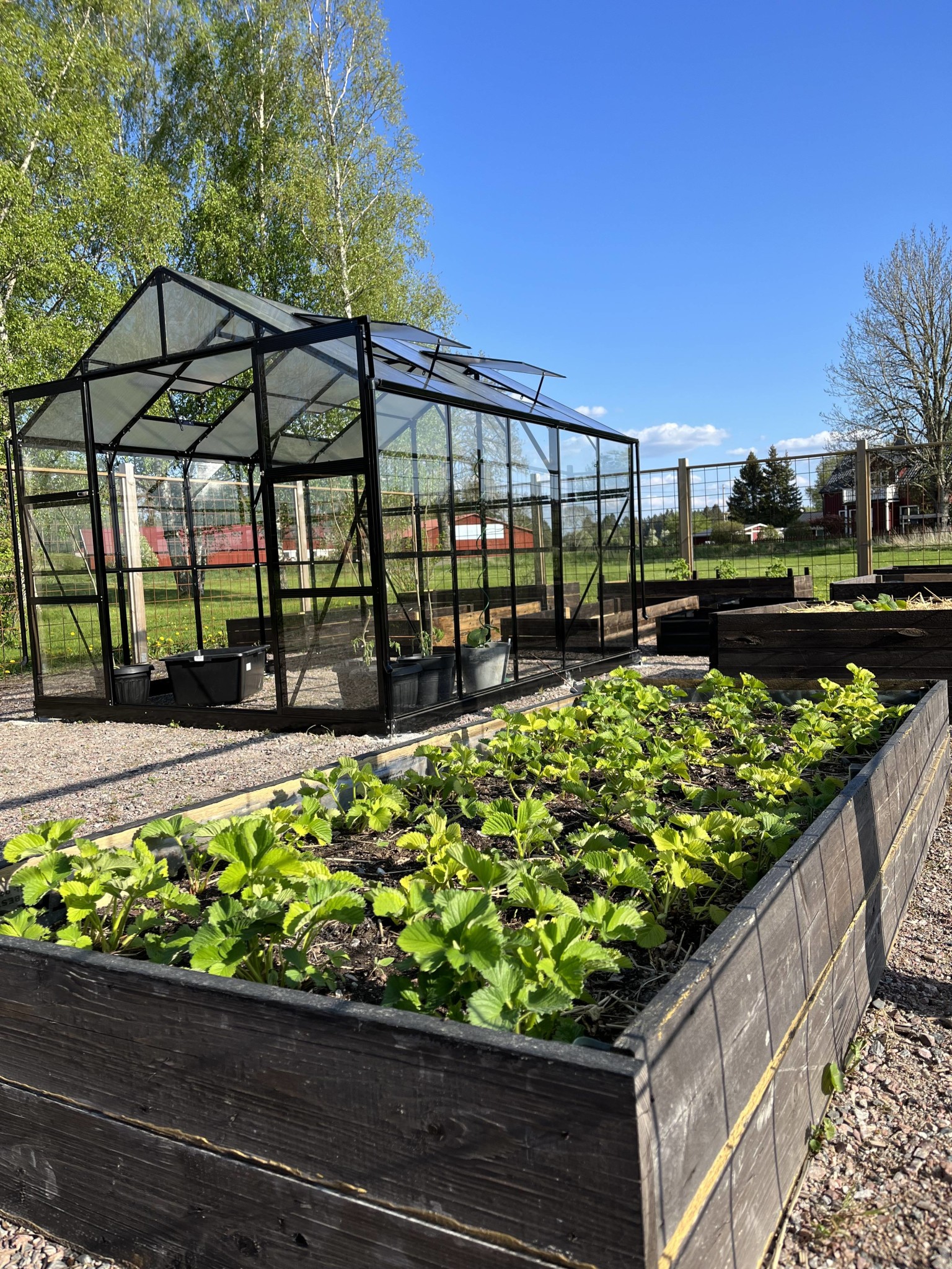 I år blir det jordgubbar, gurka, rädisor, hallon, tomter, ärtor, physalis, chili, dill, sallad… och utanför på annat ställe björnbär, rabarber, krusbär, svarta vinbär.