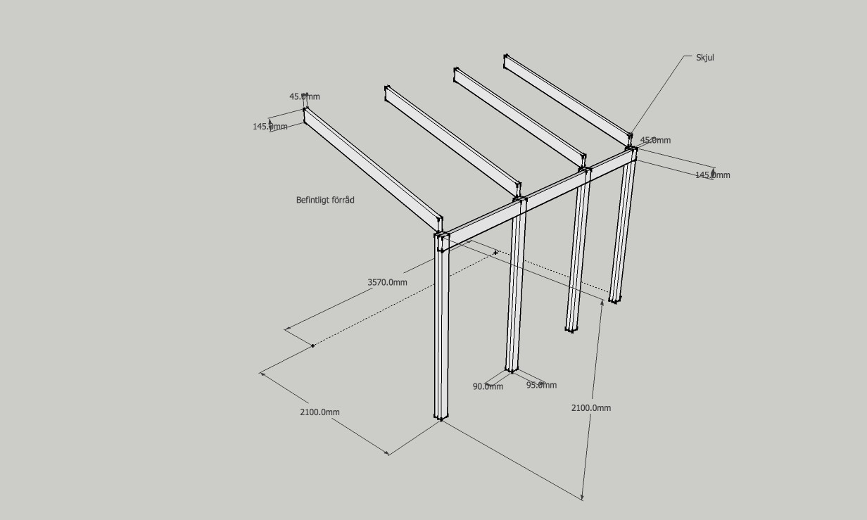 Som stolpar hade jag tänkt 4st dubbla 45x95 där den ena är 145 kortare för att hålla främre regel. Takbalkarna har CC på ca 1200. Hade tänkt dimension 45x145 där och sen ska de sticka ut ca 200 (syns ej på bilden).