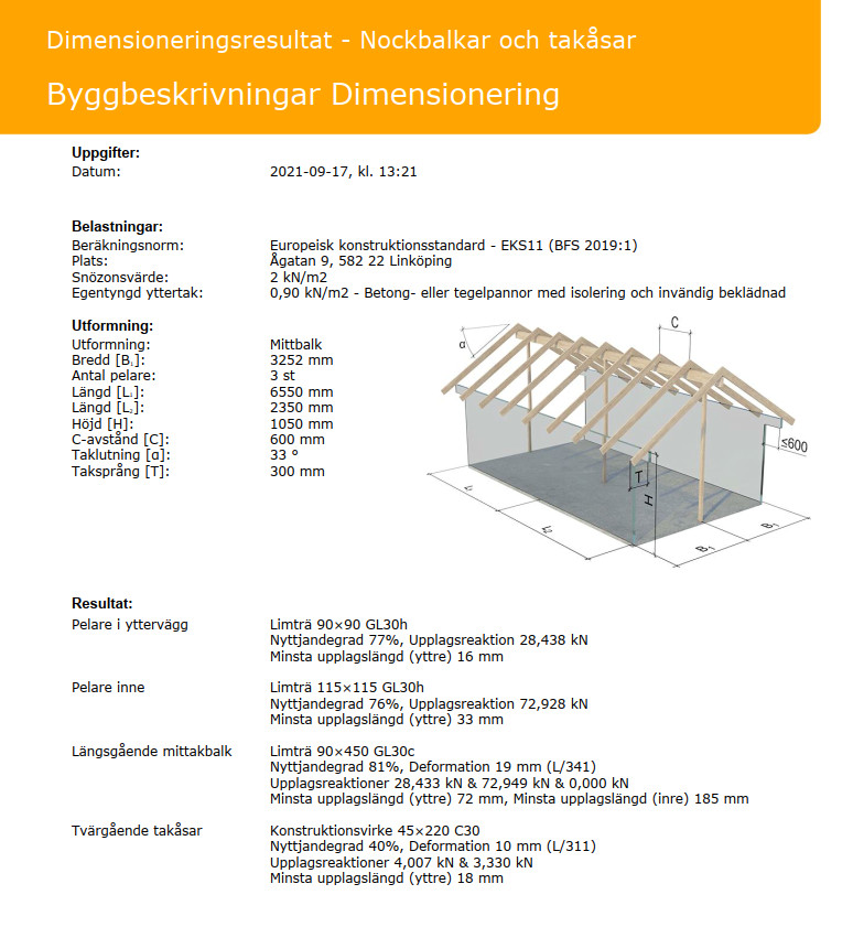 Dimensioneringsresultat för byggprojekt med tabeller och illustration av nockbalkar, takåsar ovanpå en husstomme.