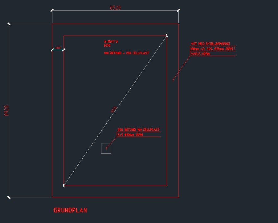 Betongplattan kommer bli förstärkt med en sula runt 700x700 under innerhörnet på den väggen.
