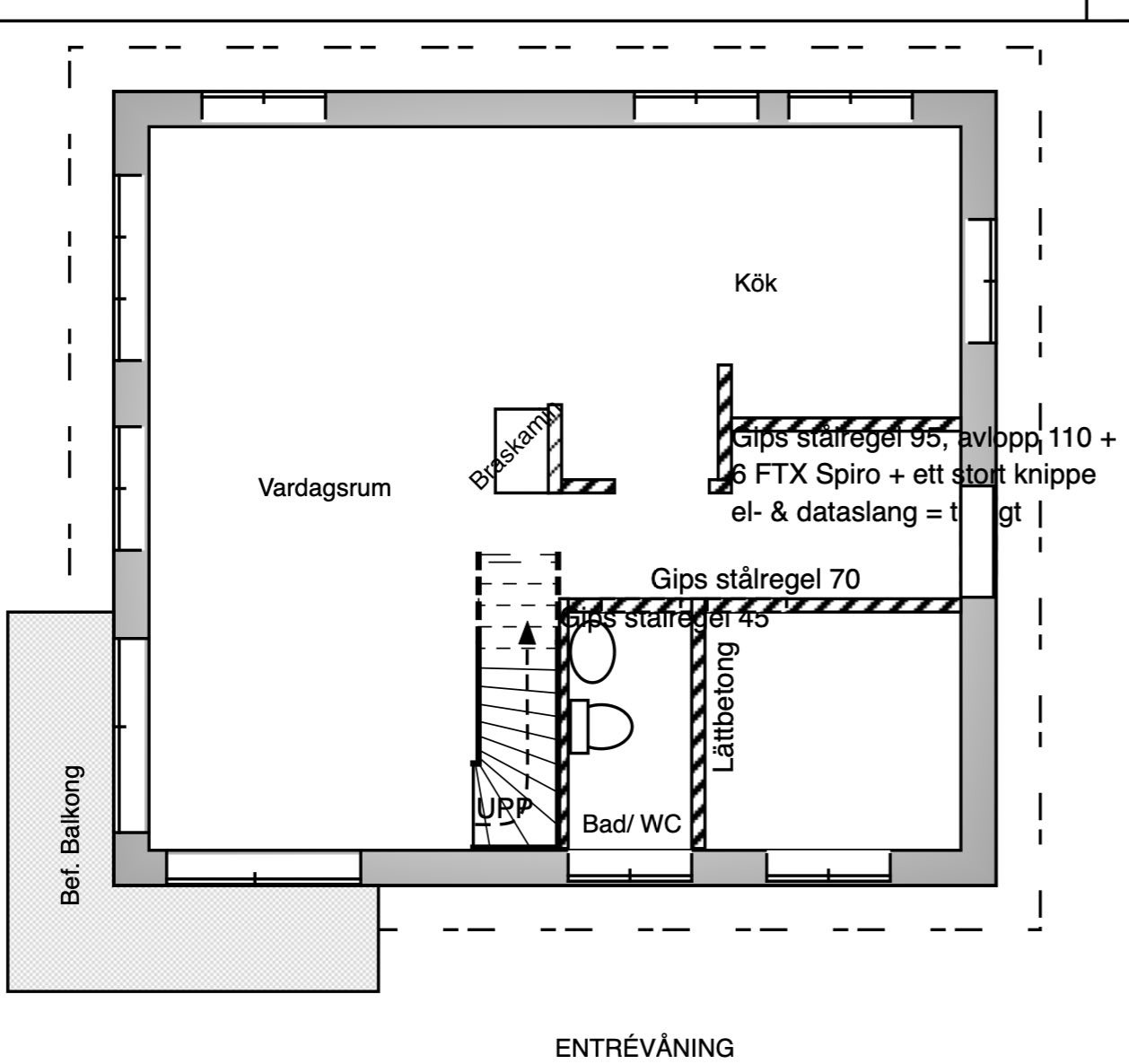 Tackar och bockar för ideer - skall funderas på.B bossespecial skrev:Bjälklaget på höger sida av väggen vid trappan skulle man kunna ställa på väggar våningen under. Bjälklagets riktning parallellt med husets bredd. Sedan skulle du kunna vända bjälklaget på delen över vardagsrummet och lägga en balk från kaminen till yttervägg. Kräver dock åtgärd på bottenvåningen. Sen ställer trappan till det lite då den skär av bjälklaget. Man skulle kunna lägga en balk till vänster om trappan och hänga upp ena änden av denna i nockbalken.