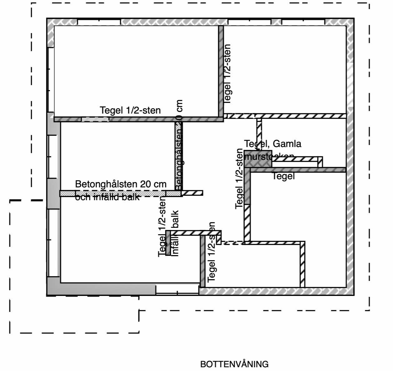 Huset är putsat betonghålsten + tegel där upplag för det nya bjälklaget är tänkt att vara en 200x200 betongbalk (4⌀10, ⌀8s400-N) som gjutes ovanpå muren runt hela huset, m leca 90 utvändigt.
