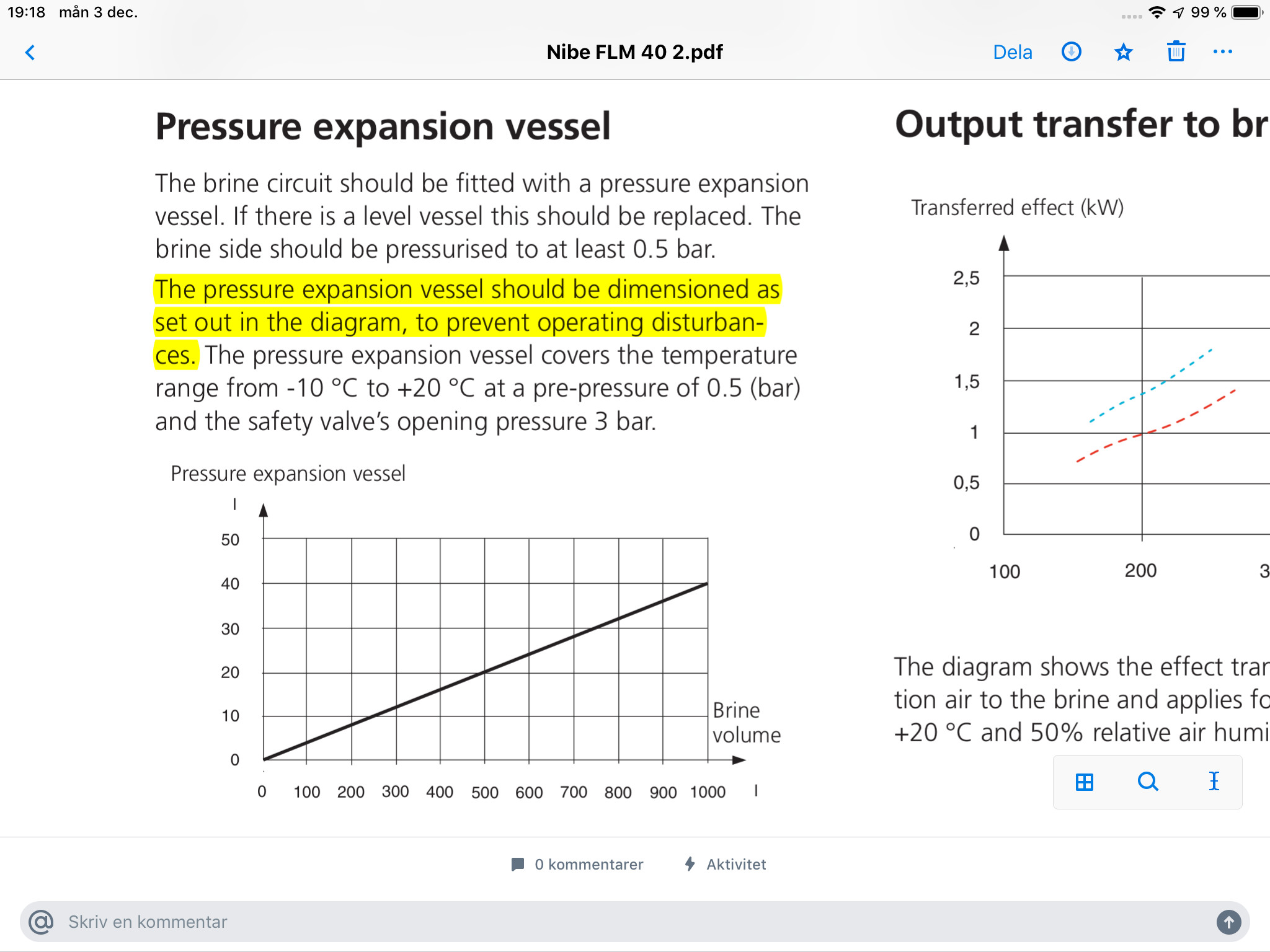 Hej Daniel! Om du har läst hela tråden ovan så kan du själv se att det måste finnas en överttrycksventil på expansionskärlet på köldbärarsidan som öpnnar vid 3 bar. Rekommendationerna och diagrammet i bilden ovan är hämtade direkt från installationsanvisningen för min Nibe FLM 40. Nibe har också informerat mig om att ovan nämnda dimensionering bör följas för att undvika driftstörningar.D Daniel 109 skrev: