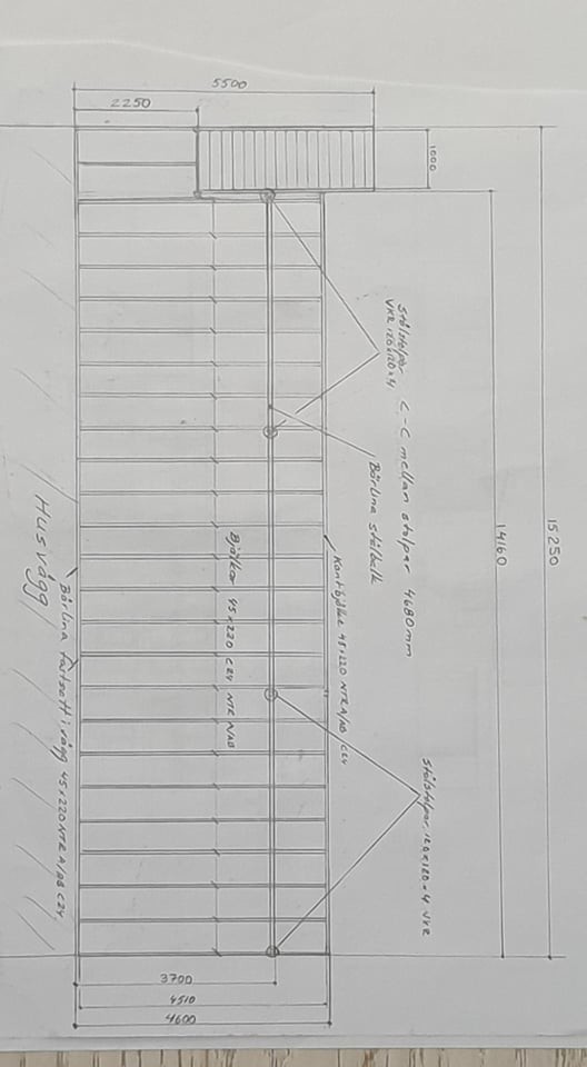 Håller på att skissar på ett balkongbygge där jag också avser också bygga ett inglasat uterum på. Jag tänker förankra bjälklaget i husväggen och den yttre bärlinan hade jag tänkta att dra in 90 cm från ytterkanten. Det gör jag för att bjälklaget kan då kanske kan göras i 45x220 virke C24. Vill inte ha för många stolpar under balkongen så jag har ritat in 4 st och fördelat dem jämnt. CC-stolpar är 4680 mm. Har inte koll på vilka laster man ska dimensionera för vilket jag hoppas någon här kan bistå med. Som kanske framgår av skisserna så har husets originaltak ett sticker ut ca 2000 mm över balkongen. Yttre stolpar från uterummet kommer också att ligga rakt ovanför den yttre bärlina, dock kommer bara den ena av stolparna vara rakt ovanför bärlinans stolpar. Det jag skulle vilja ha hjälp med att dimensionering av den yttre bärlinan som är som jag skulle vilja att den är så låg som möjligt och någon har någon annan idé som kan göra bygget både bättre och billigare. All hjälp tas tacksam emot. Bor strax söder om Jönköping på gränsen till 3