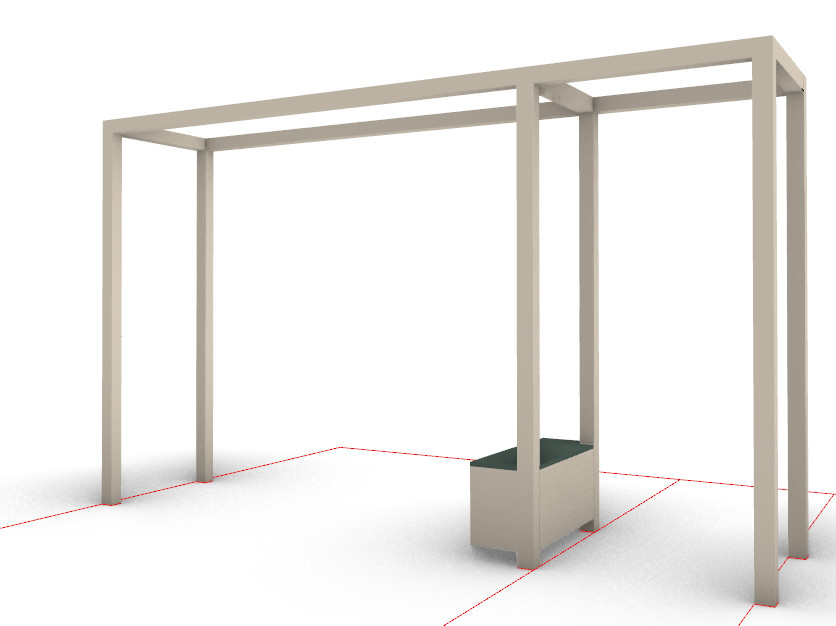 Alt 2. Alla tre bågar sammanfogas med en central bjälke i samma dimension. 4st vajrar spänns upp längsgående som vinrankorna kommer hänga/klättra i.