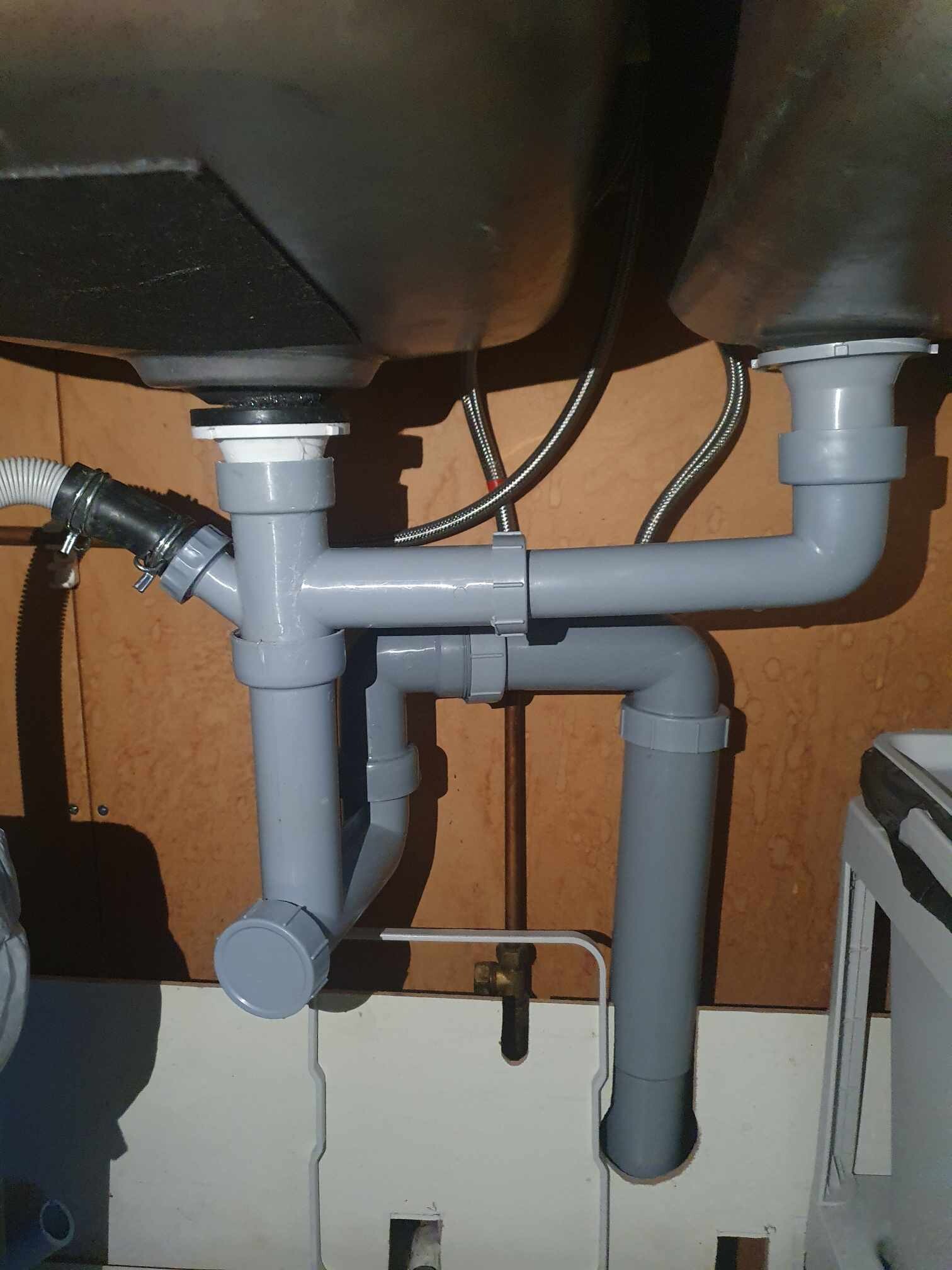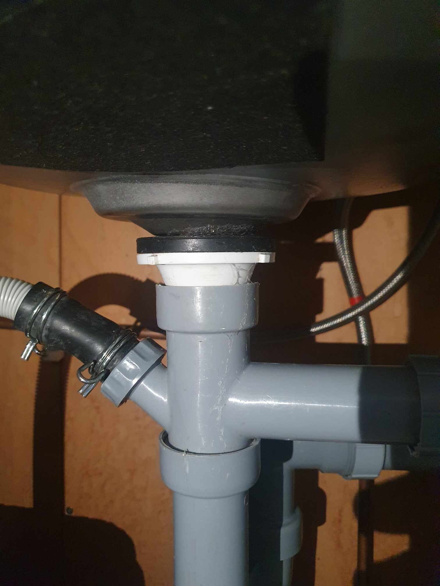 Det läcker under diskhon och anledningen är att det inte är tätt där diskhon ansluter till avloppet. Den vita delen som silen i diskhon skruvas fast i så att allt håller ihop är sprucken vilket gör att skruven inte går något fäste.