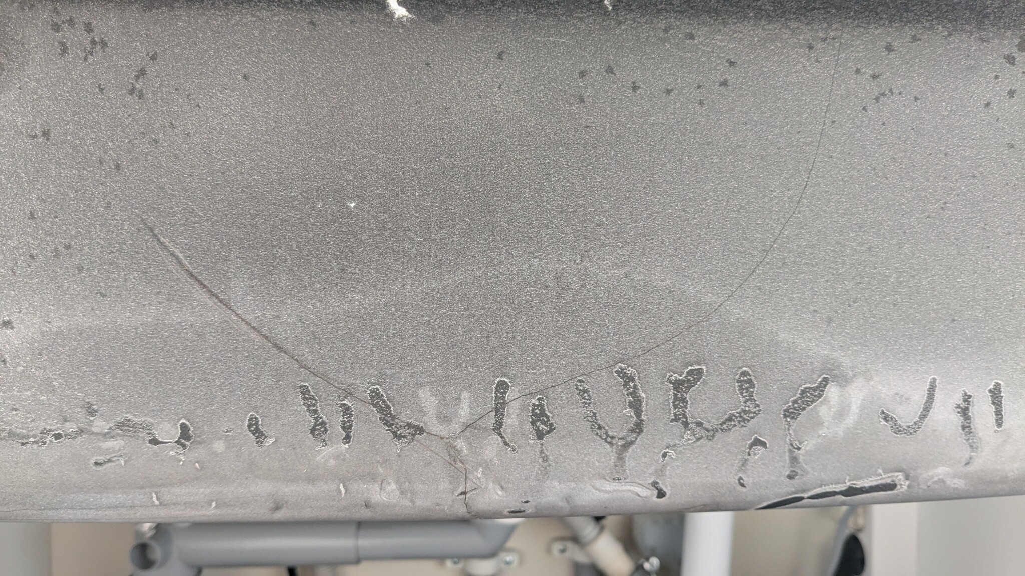Det är också svårt att se i diskbänken. Men sprickan delar sig åt två håll och man känner också att delarna inte längre sitter ihop.