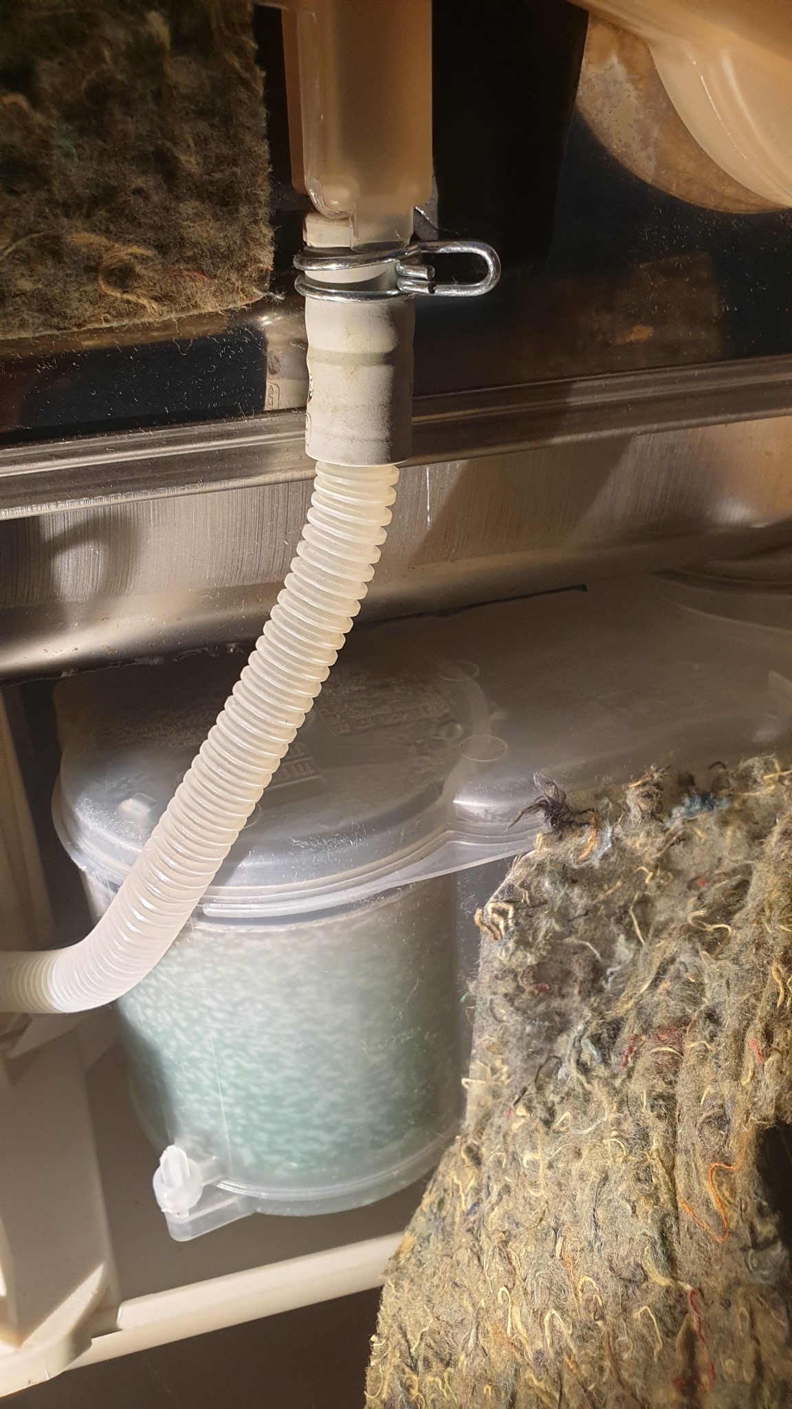 Diskmaskin AEG: Avlopspumpen stannar inte, avhärdarsump tank full med grön gel