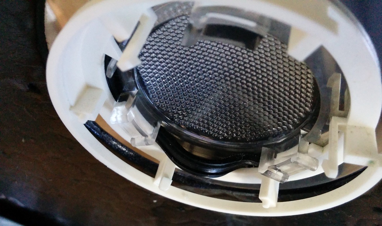 När jag för några dagar sedan försökte köra in den undre korgen i maskinen så fastnade en smal skärbräda mellan lampglaset och maskinens insida. Svor lite över lampans design vid tillfället men när det inte förändrade något så lirkade jag loss skärbrädan och glömde det hela. Skärbrädan hade så klart tryckt in packningen runt lampan, se bild nedan.