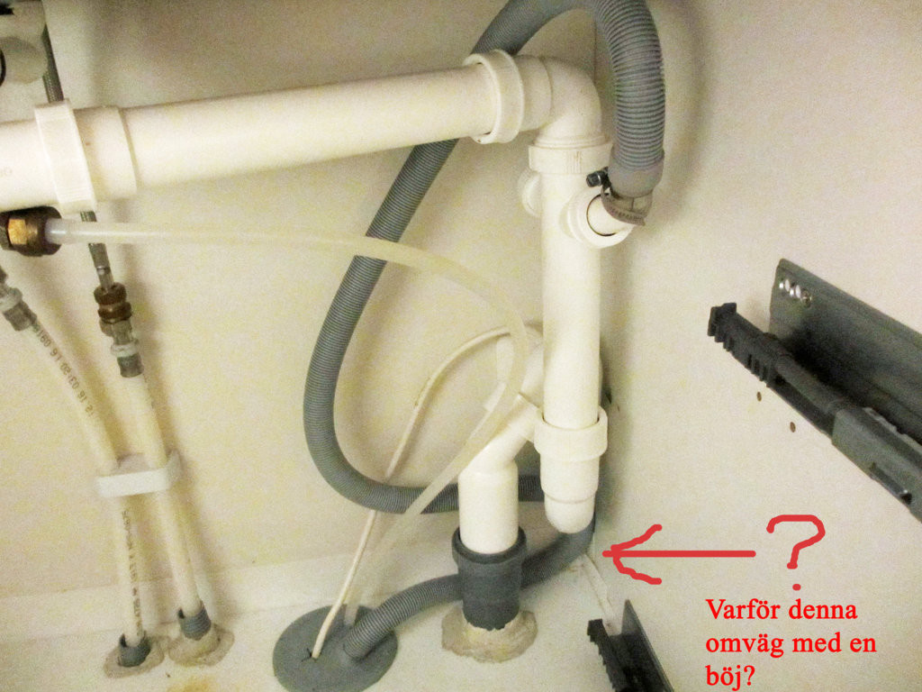 Men kan inte böjningen av avloppsslangen nederst, innan den vandrar upp mot avloppet, vara boven. Se min bifogade bild. I monteringsanvisningen anges "Koppla in vattenutloppsslangen till avloppsröret utan att böja den". Kanske pumpen inte orkar pumpa upp vattnet till avloppet på grund av omvägen via böjningen.