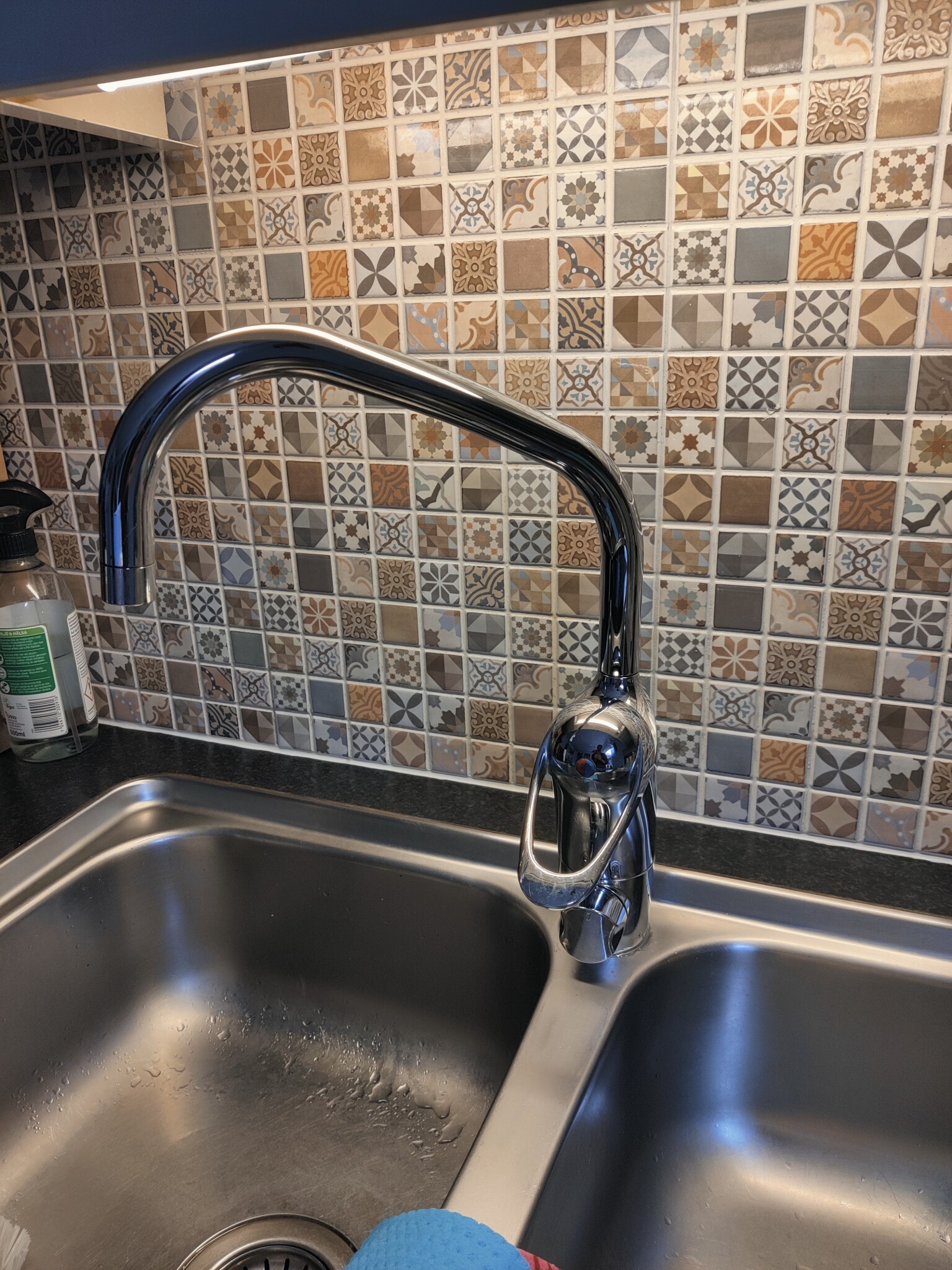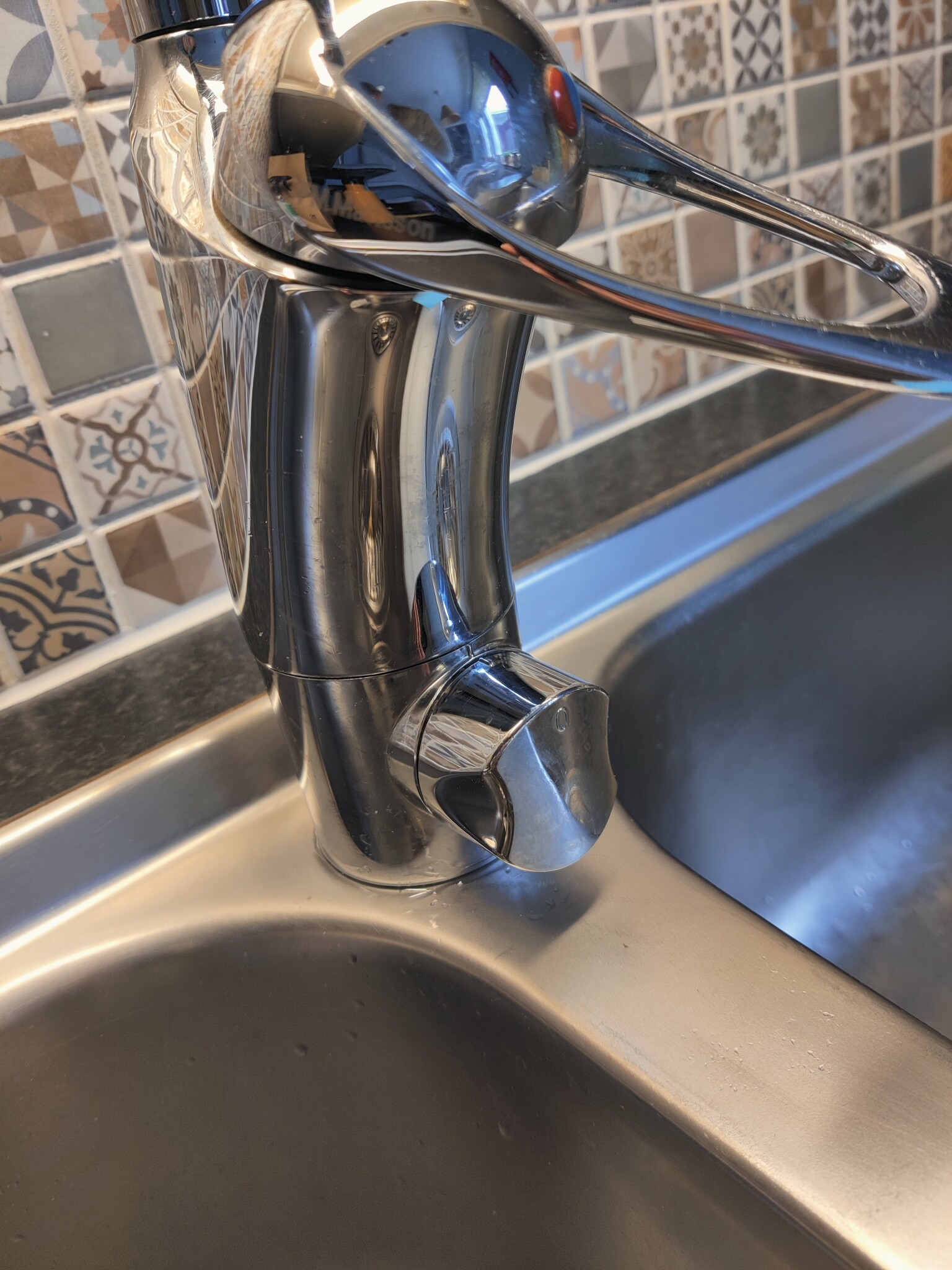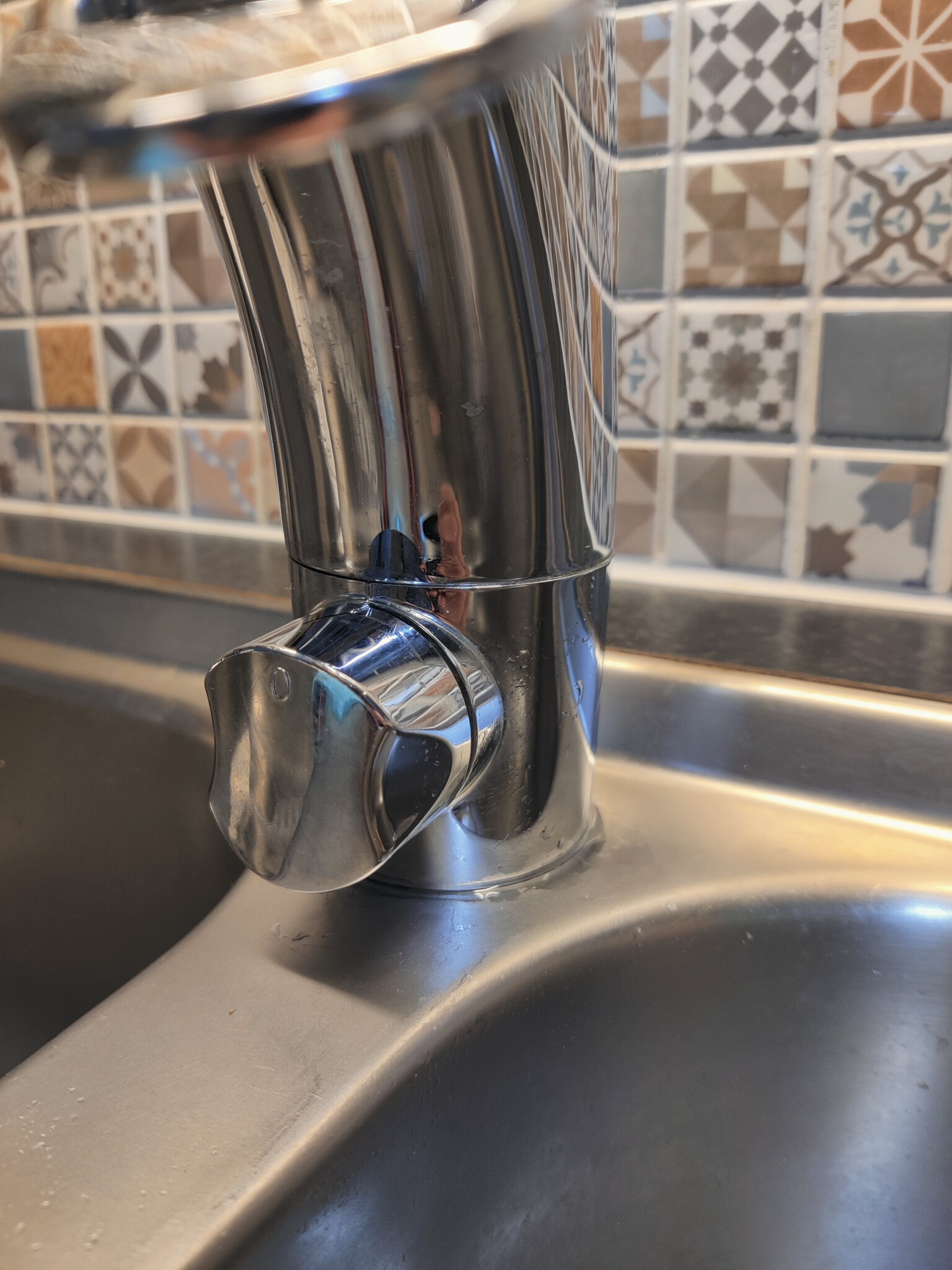 Tyvärr verkar vår blandare i köket läcka. Vattnet kommer från reglaget för diskmaskinsavstängningen. Det är svårt att få på bild, men vattnet kommer rakt underifrån diskmaskinsavstängningen och efter någon timme samlas en liten pöl på diskbänken.