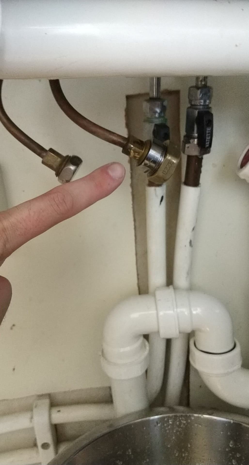 Min första fråga är, varför finns det två rör från blandaren? Diskmaskinskopplingen ska in på den större av rören, där satt den gamla med.