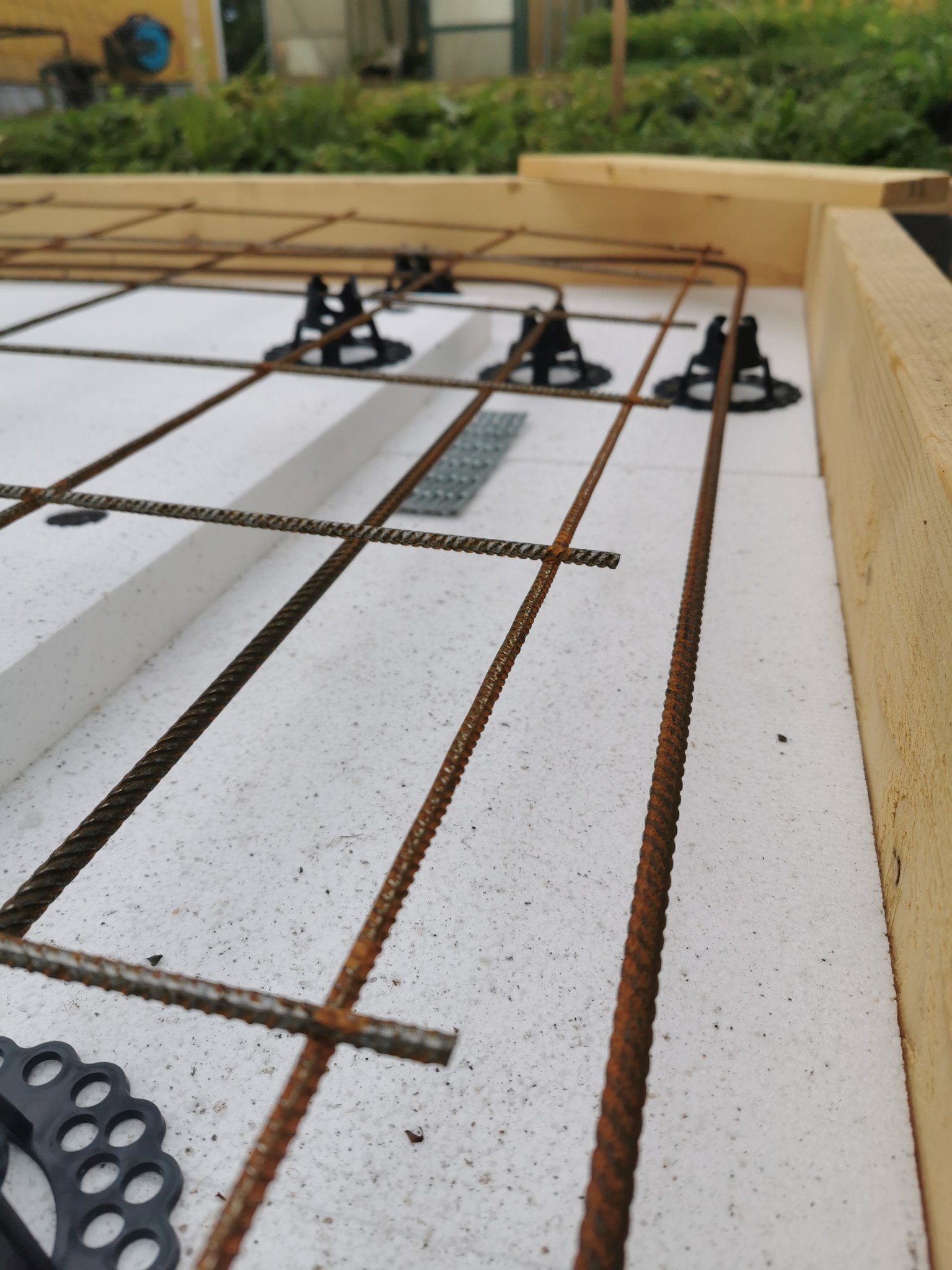 Vi har köpt armeringsdistanser som placerar armeringen med det avståndet från cellplast en. Nu till problemet, armeringsnätet är inte tillräckligt styvt utan böjer sig ner mot kantarmeringen så att avståndet mellan armeringslagren inte blir korrekt i kanterna