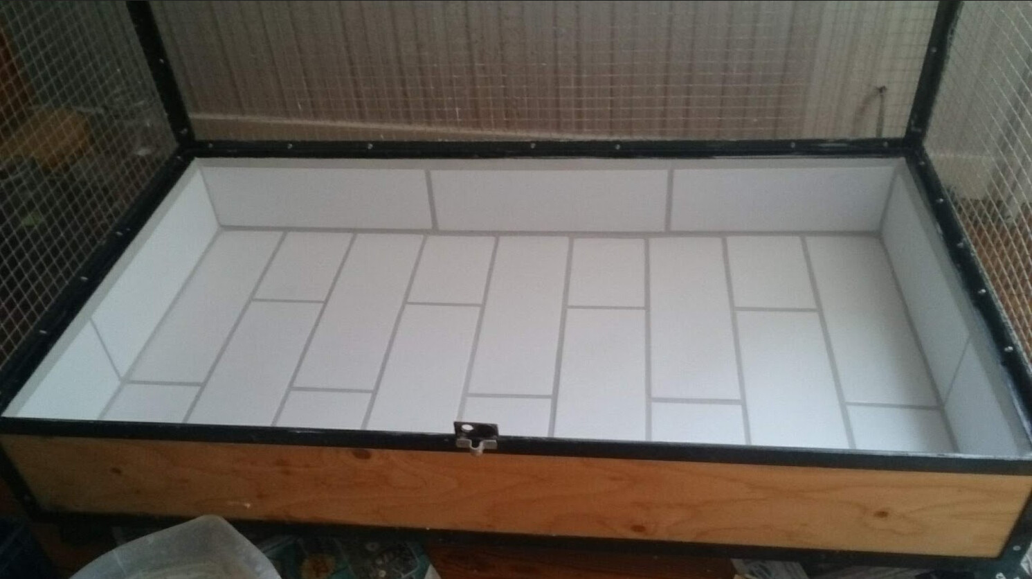 Hade en plastmatta på botten först, men bytte till kakel när fåglarna började äta på den...