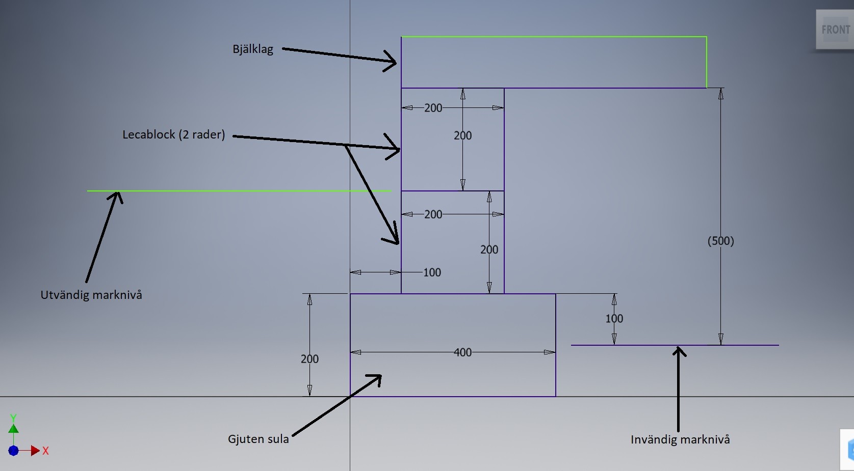 Jag hade tänkt att gjuta en sula (b=400 mm, h=200 mm) och på den mura två lager med murblock. Börjar fundera på om detta är lite snålt, man kanske skulle ha tre lager murblock. Jag vill inte att utsidan på grunden ska bli allt för hög (ca en rad med murblock), med det sagt gräver jag lite djupare för att få samma nivå i förhållande till marknivån.