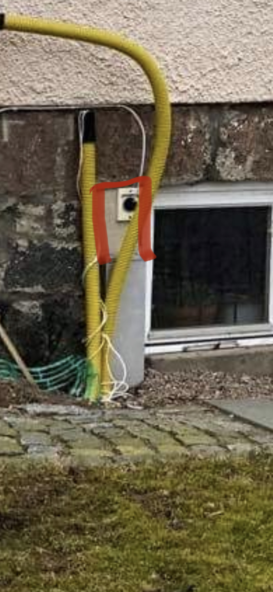 Har förberett för fiber (gul slang) som jag tänkte dra in via centraldamsugaren (hålet ovanför plåtboxen). Skulle vilja ha en låda som täcker hela vägen upp (rödmarkerat).