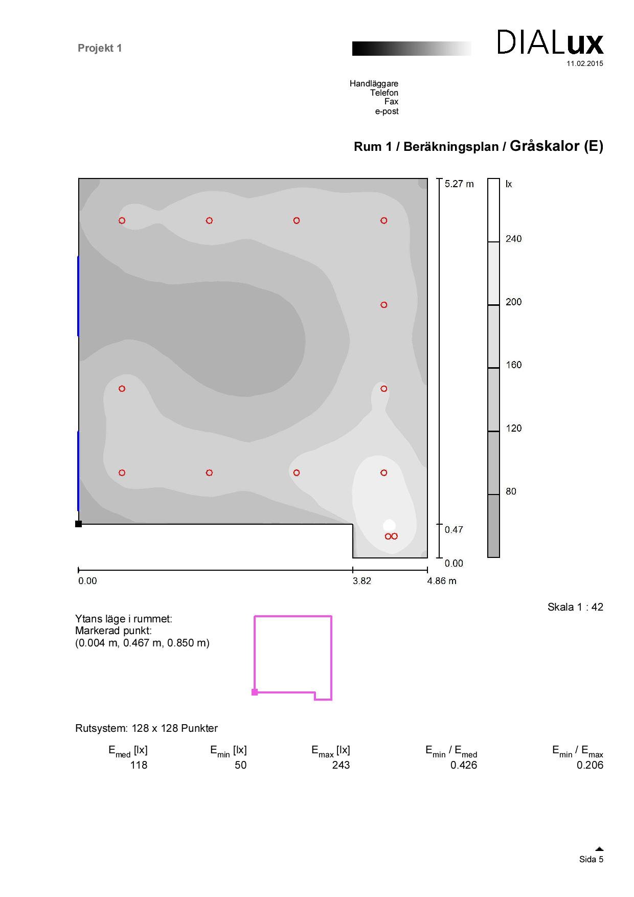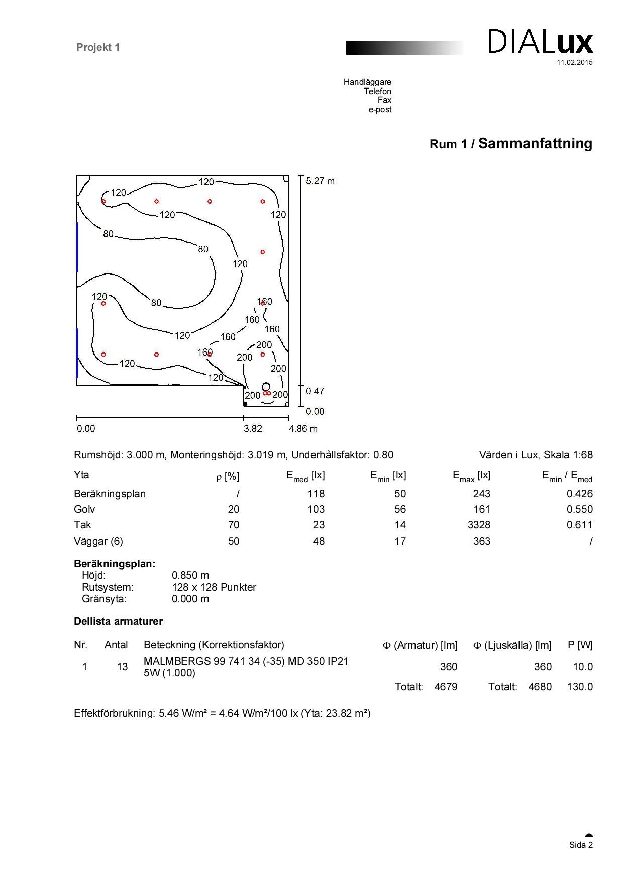 Beräkningen är gjord med standardvärde för färg och reflexion på golv väggar och tak. Utan inredning och utan att ta hänsyn till ev. ljus igenom fönster.