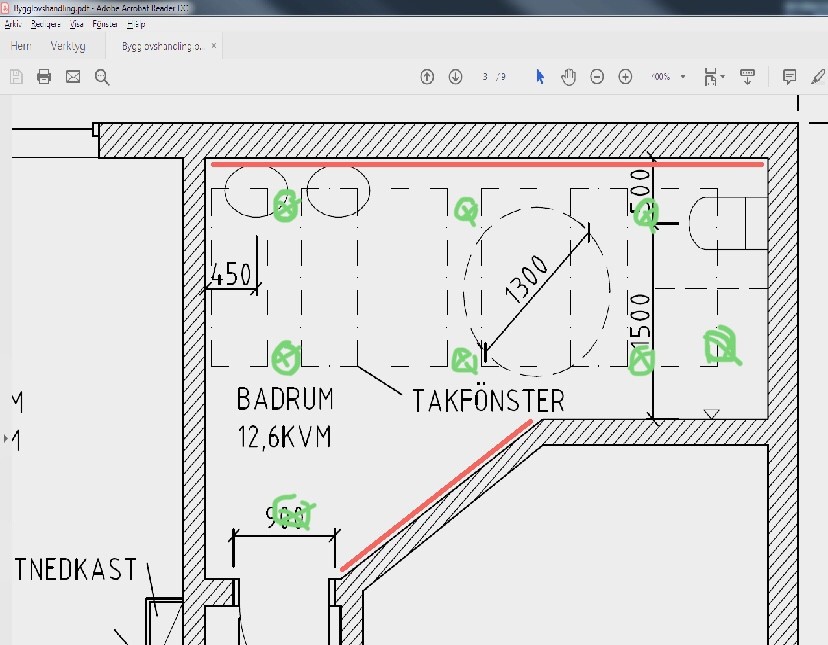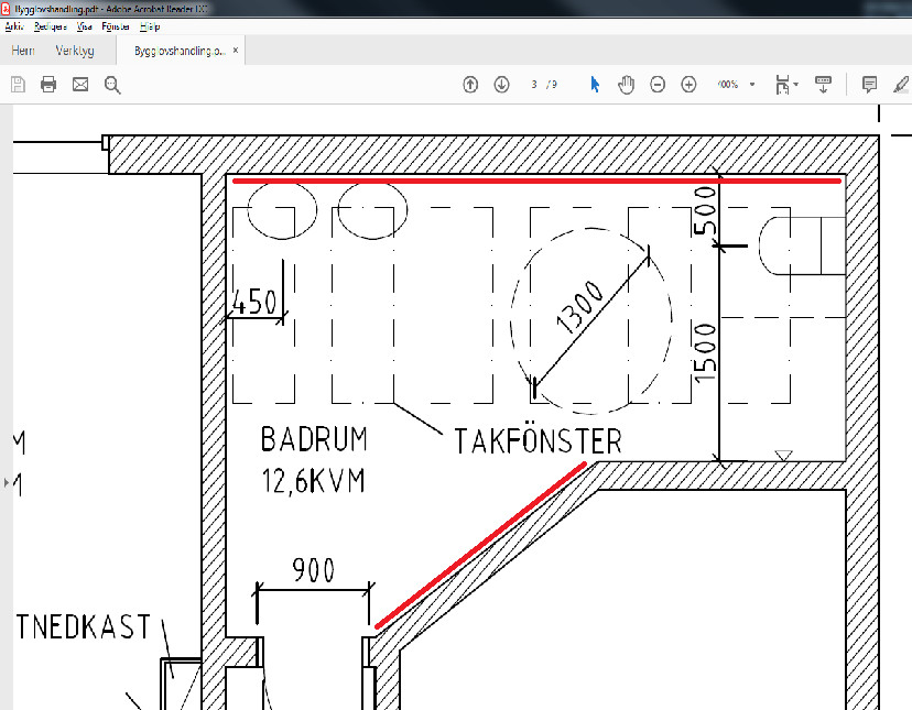 Dessa "spottar" kommer enbart placeras längs med långsidan av badrummet( se rött streck) då vi har takfönster i stort sett hela taket. På motsvarande sida i hörnet (se rött streck) kommer det finnas en helfigursspegel med belysning på var sida om.