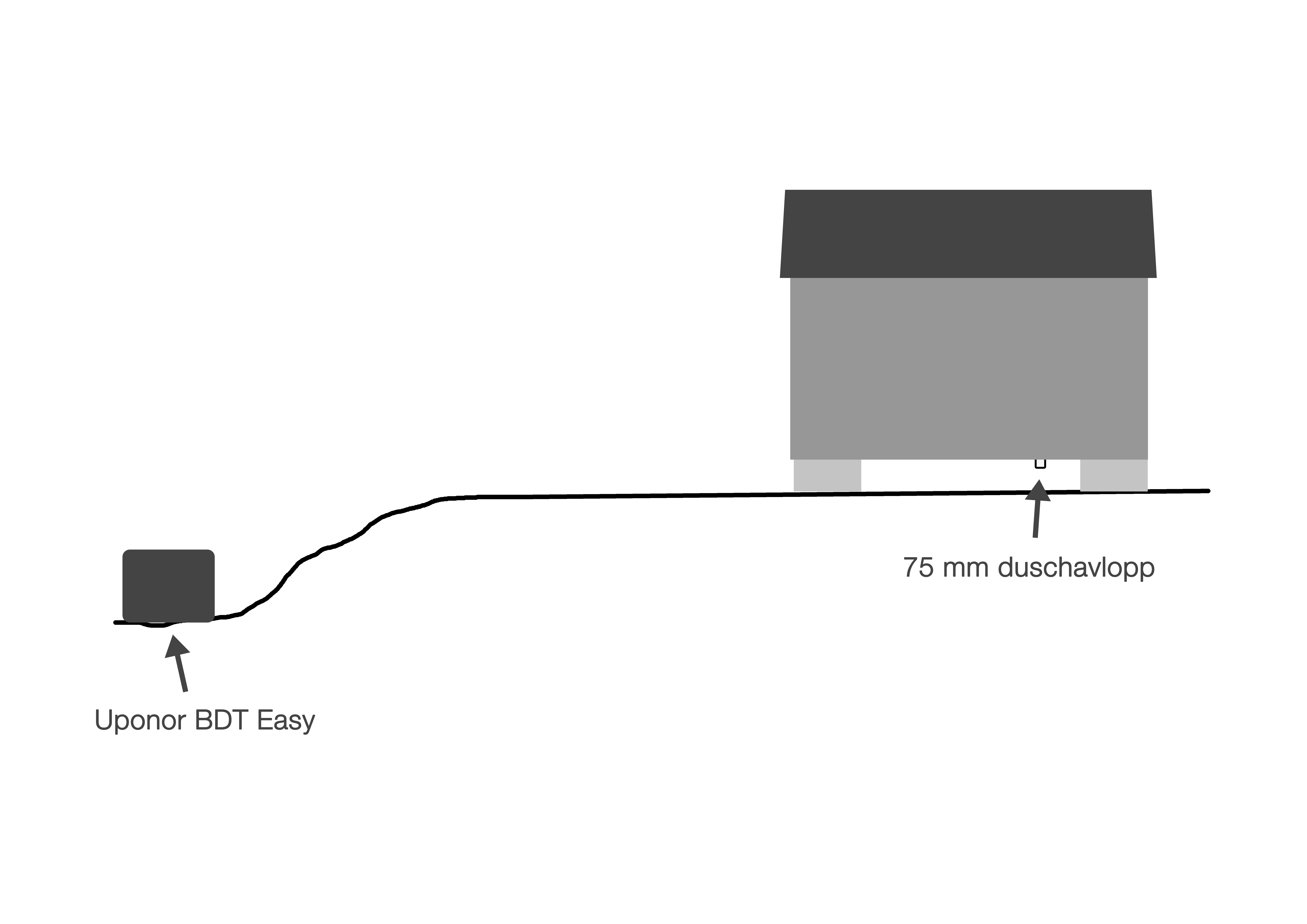 Huset ligger på ett litet skogsbeklätt berg. Därför tänkte vi att Uponor BDT Easy skulle passa bra som rening av duschvattnet. Den kan då stå nedanför bergssluttningen. Det är kanske 15 meter dit.