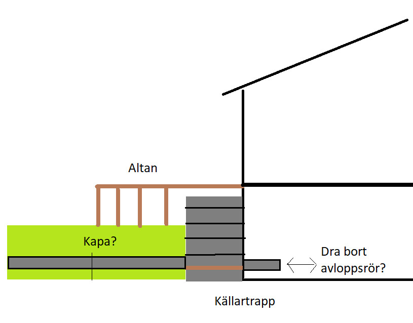 Men då fick vi idén att man kanske kan gräva sig ner till avloppet på en öppen del av gräsmattan för att sedan dra ut det från under trappan och altanen. Och samtidigt som man gör det, kanske man trycker in det nya plaströret. Vad tror ni om det, är det vanligt att man gör på detta viset?