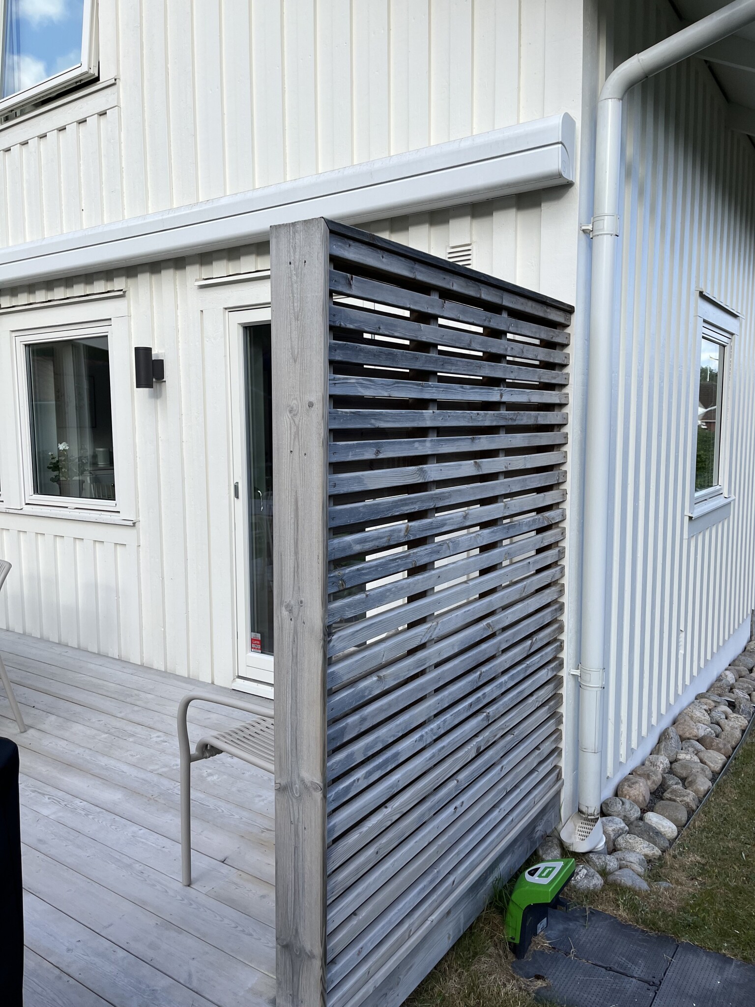 Visst, utanpåliggande kabel, men det kan jag leva med… gäller bara att få den längs med panelen och inte tvärs över, får dra den undertill vid grunden kanske, eller under takfoten?