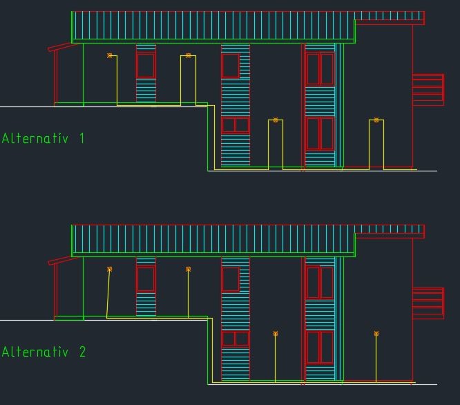 I alternativ två så har jag tänkt mig kopplingsdosor som sitter rakt under lampan men nere på grunden. Jag måste ta mig förbi de streckade partierna som är trä som inte tas bort (resten är en putsfasad som byts till trä). Rören kommer att gå rakt ner från lampan så att man vet var dom går.