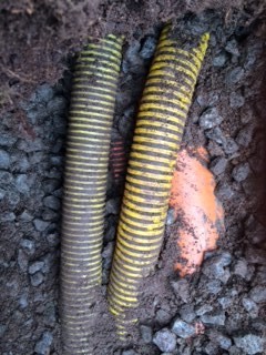 Efter att nu ha grävt mig fram till rören undrar jag om jag har lite tur. Det verkar som att jag har två gula kabelskyddsrör, och i elskåpet syns det att det något mer neongula röret inte innehåller någon kabel. Finns det någon skillnad mellan gula och neongula kabelskyddsrör, är det neongula egentligen avsett till något annat?
