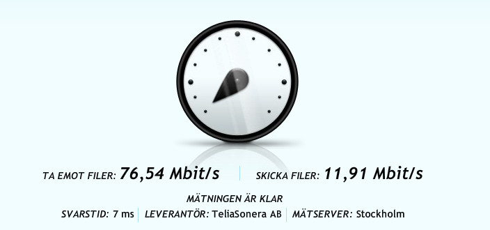 I praktiken ligger vi på 85 Mbit/s trådanslutet och 75 Mbit/s via WiFi. Då ska man även ha i åtanke att TV-boxen drar minst 8 Mbit/s och att ett vi har ett flertal datorer och en webserver igång samtidigt som mätningarna görs.