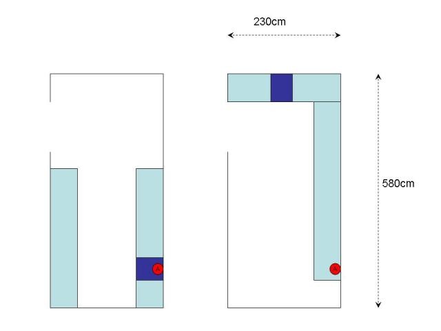 Köket är i grunden ett klassiskt radhus kök (vänstra skissen) med vasken (mörkblå rektangel) och avloppet (röda markeringen). Hela övre kortsidan är det fönster som vi tycker hade vart mycket trevligt att en diskbänk med vasken mot.