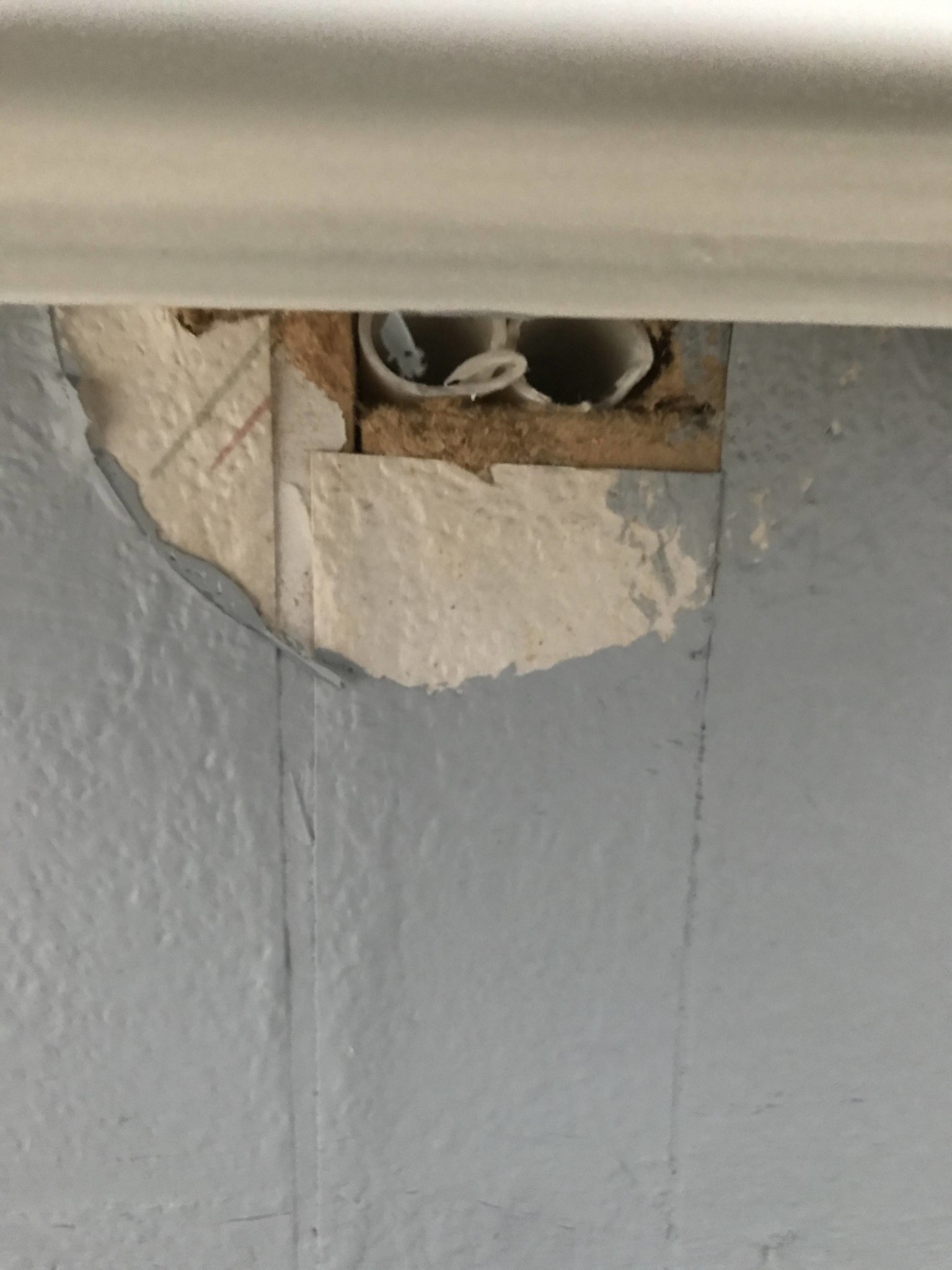 Ett av rören kom man typ halvvägs medan det bredvid fungerar och tänkte då nyttja det för ett nytt eluttag nedanför till fönsterbelysning.