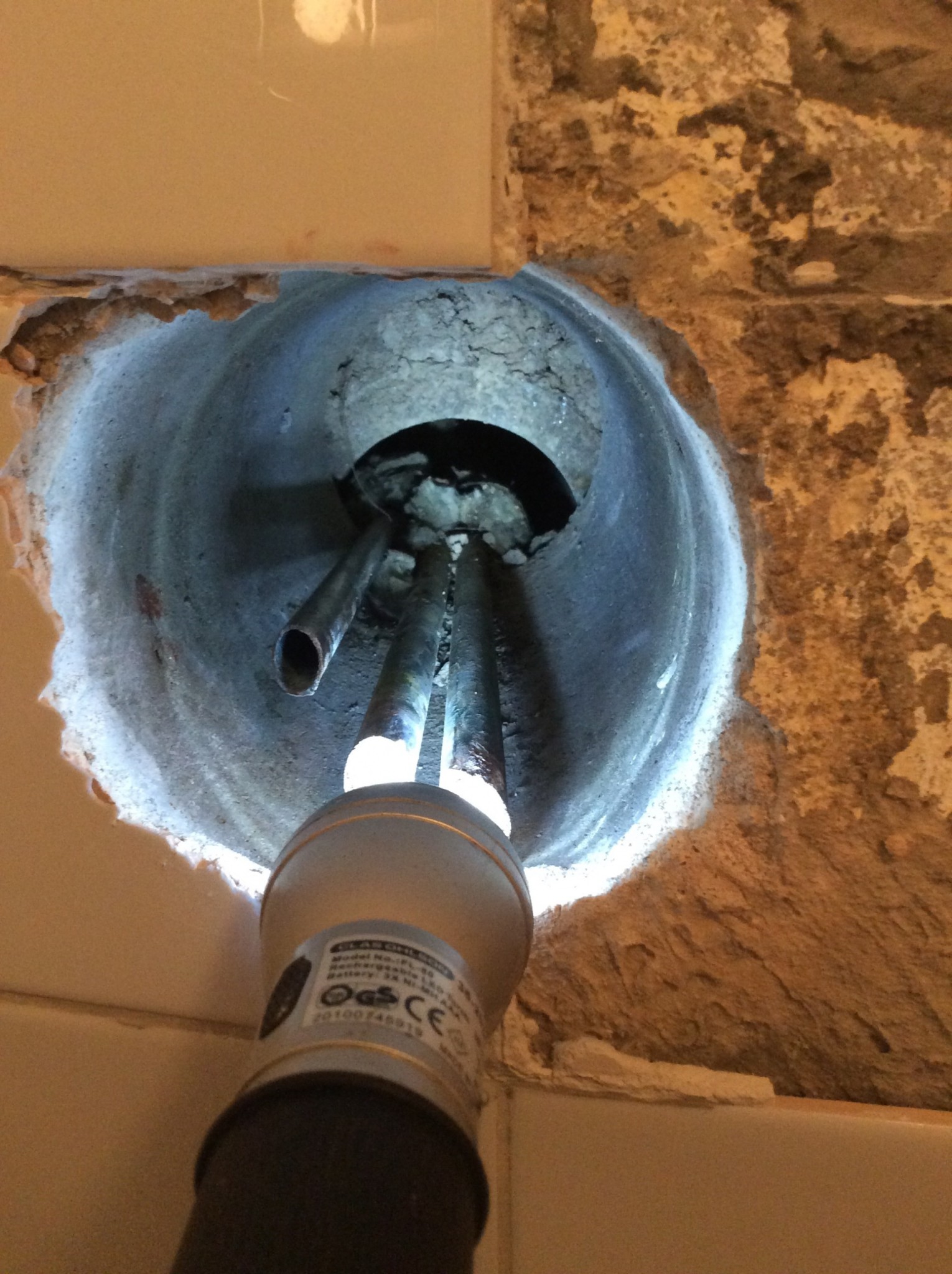 Det sitter kakel över genomförningen in i källaren så tänkte pilla bort en platta för att se hur det ser ut in genom källarväggen. Har inte gjort det än....