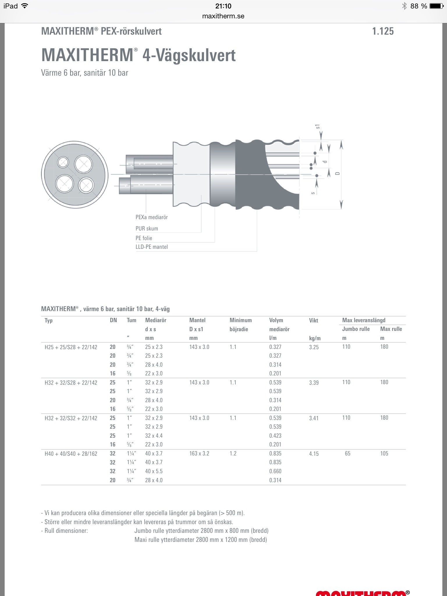 Använd 20mm till värmen och 16mm till varmvatten/kallvatten för att minska spoltiden innan du får varmvatten.