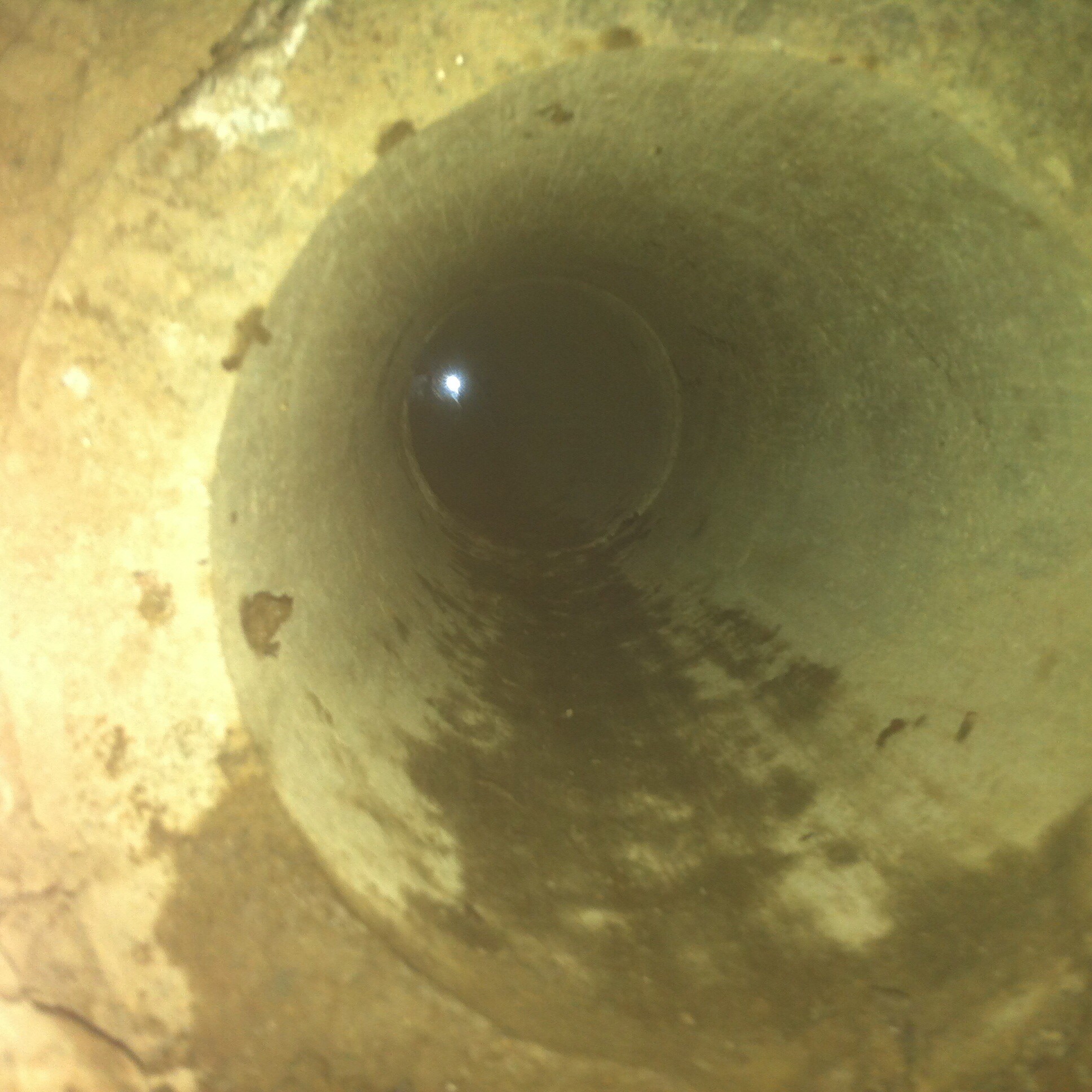 Det är ett cementrör på 5m gissar 1m sektioner. De ligger inte helt rakt men man se hela vägen till garaget.