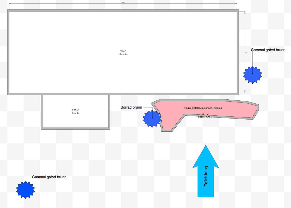 Jag har köpt ett hus från tidigt 1900 tal, timmerstomme och rejäla stenar till grund. Från början har det nog varit en vanlig öppen torpargrund, men av någon anledning så har man vid något tillfälle murat igen grunden, klantat till det och fått hussvamp. Hela bottenplanet är nu utrivet och urgrävt och jag ska i med plast och en avfuktare. Har haft hjälp av Anticimex och han rekommenderade att släta ut marken mot huset på östra sidan där fallet ligger mot huset för att minska att ytvatten skapar mer fukt i grunden. Jag funderar på om jag även borde lägga dränering på den sidan och runt huset på kortsidorna. Fick rådet att i så fall inte lägga det för nära huset då jag skulle kunna få sättningar om marken torkar upp för mycket/för fort. Nu har jag grävt för ny el och upptäckte att det var väldigt fuktigt i marken 1,5 meter ut från huset och 0,5 meter ner (se bild). Jorden blev alldeles mättad på fukt och rena gyttjan. Jordtypen är morän och stenigt som satan. Till det så finns det hela 3 brunnar ganska när huset, ingen används så funderar på att gräva igen dessa, men kanske ger en antydan till att det finns vatten i marken. Kollade i den ena som har lock, den längst till vänster på bilden, och vattnet står 1,5 meter ner (har inte koll på om den står högt, men har ju varit rätt blött den här hösten).