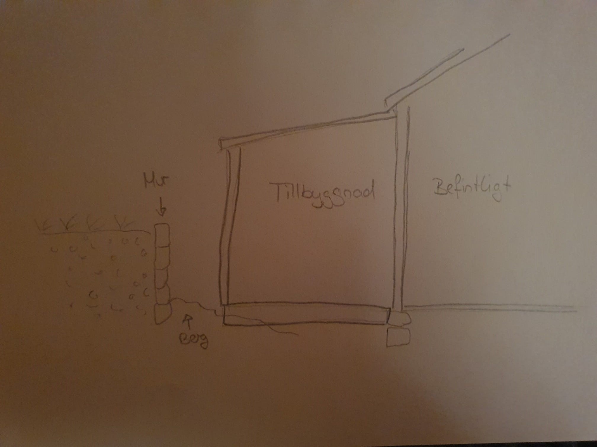 Som ni ser på bilden ska jag bygga ut mitt torp. Torpet ligger i lutningen, så vatten rinner från muren till byggnaden. Det var redan innan ett problem då det fanns ingen dränering på det befintliga huset. Nu ska jag bygga ut på den sida och vill fixa dränering till tillbyggnaden och samtidigt till det befintliga.