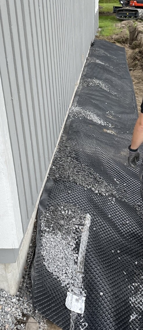 På sidan där det var samlat vatten under våren testade vi att lägga fuktisolermatta som vall från huset ner till dräneringen. Tanken är att smältvatten runt huset inte ska söka sig till huset utan ledas ner till dräneringen.(se bild) Vet inte om den har någon effekt men tänkte att det inte skadar.