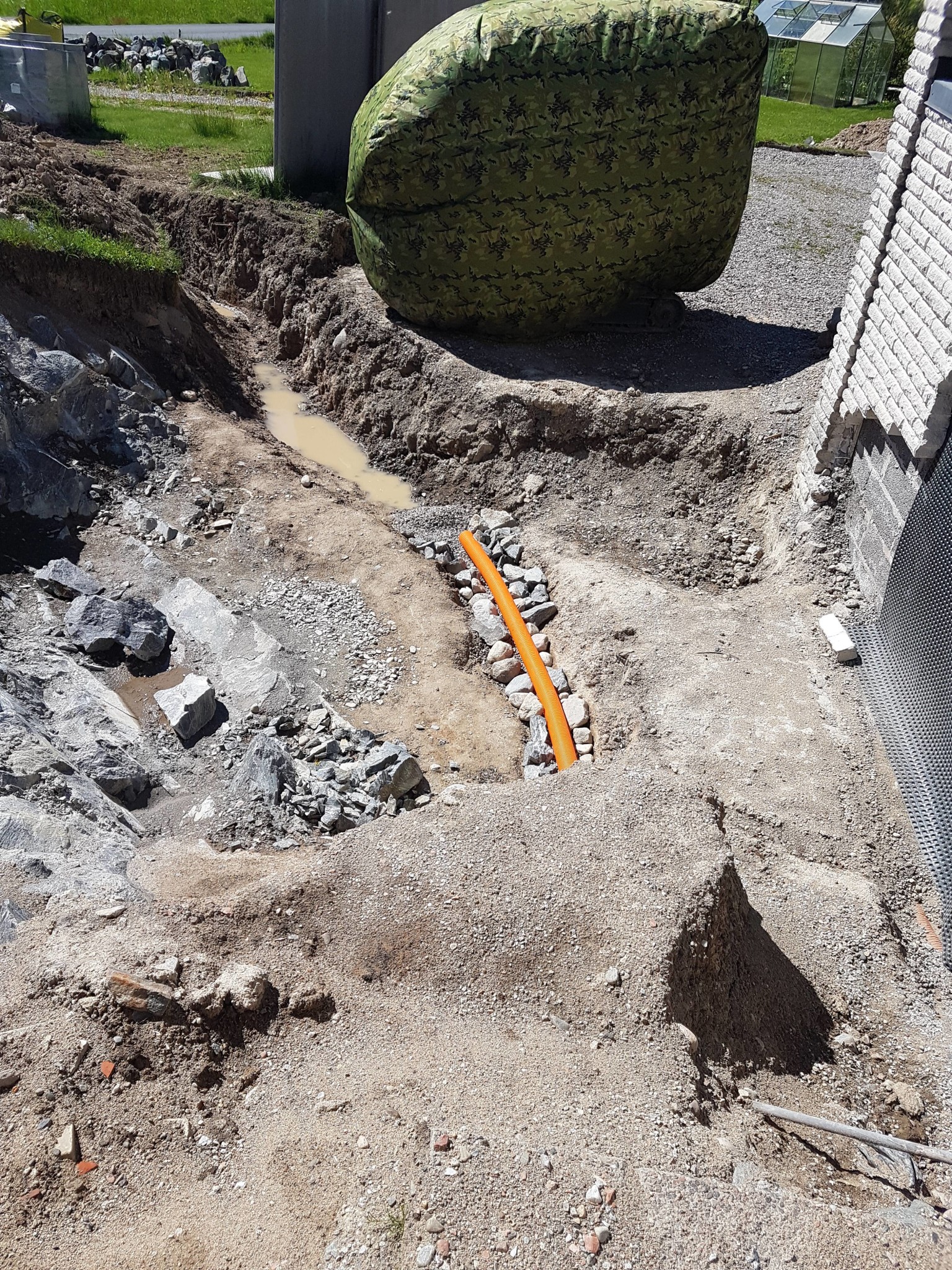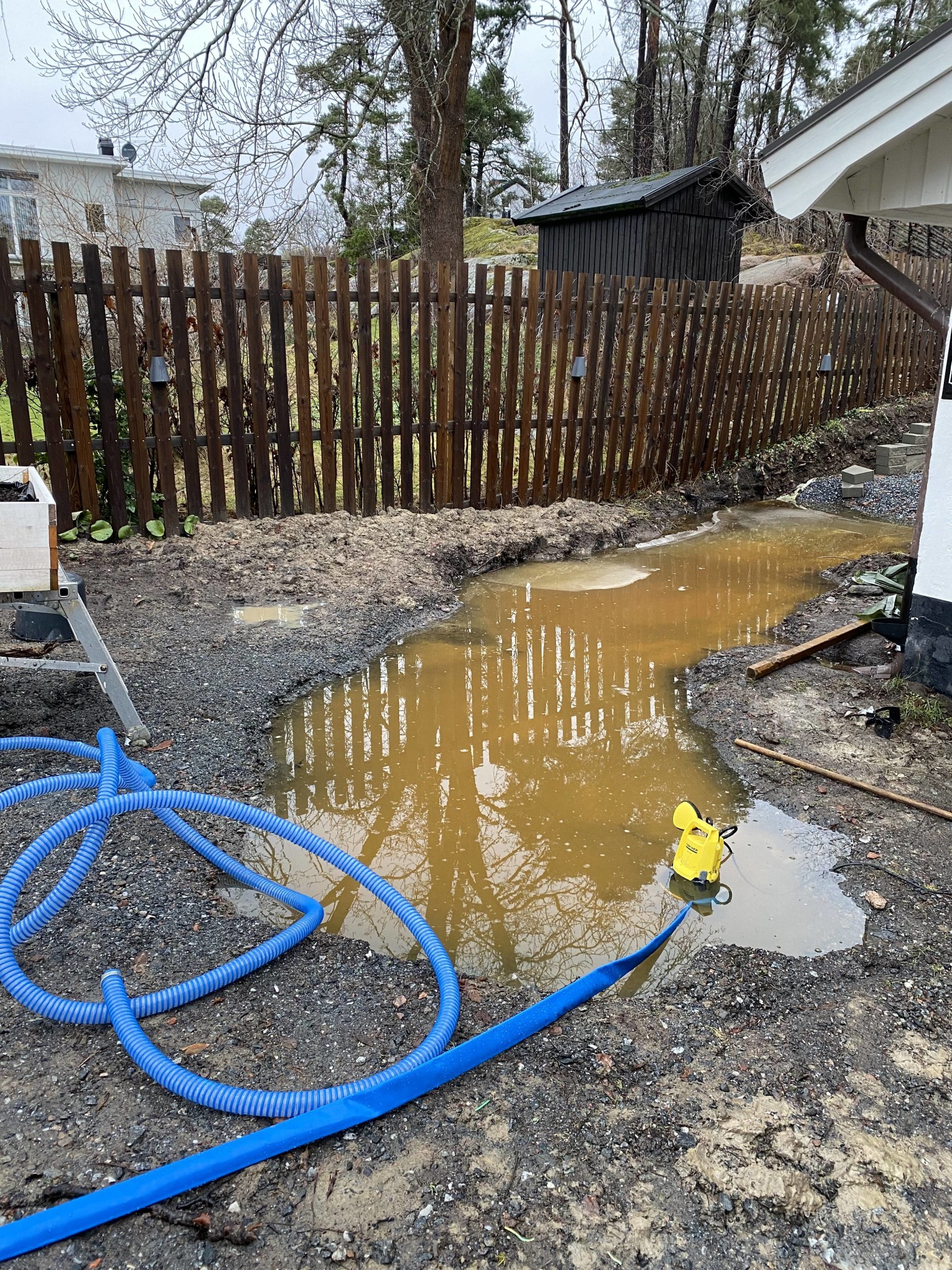 Vi har problem med översvämning vid vårt garage och har nu grävt ut och lagt ner vattenkassetter. Vi har ännu inte fyllt med makadam då det hann börjar komma snö så fort vi grävt och lagt ner kassetterna. Det som oroar oss nu är att vi grävt för lite och lagt ner för få vattenkassetter (12 st) då, som ni ser på bilden, har översvämning i hålen. Vad kommer då inte hända om vi lägger makadam i hålet som tar yta?Det är lerjord så därför har vattnet svårt att rinna undan. Någon som kan erfarenhet?